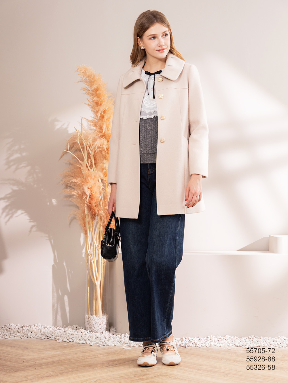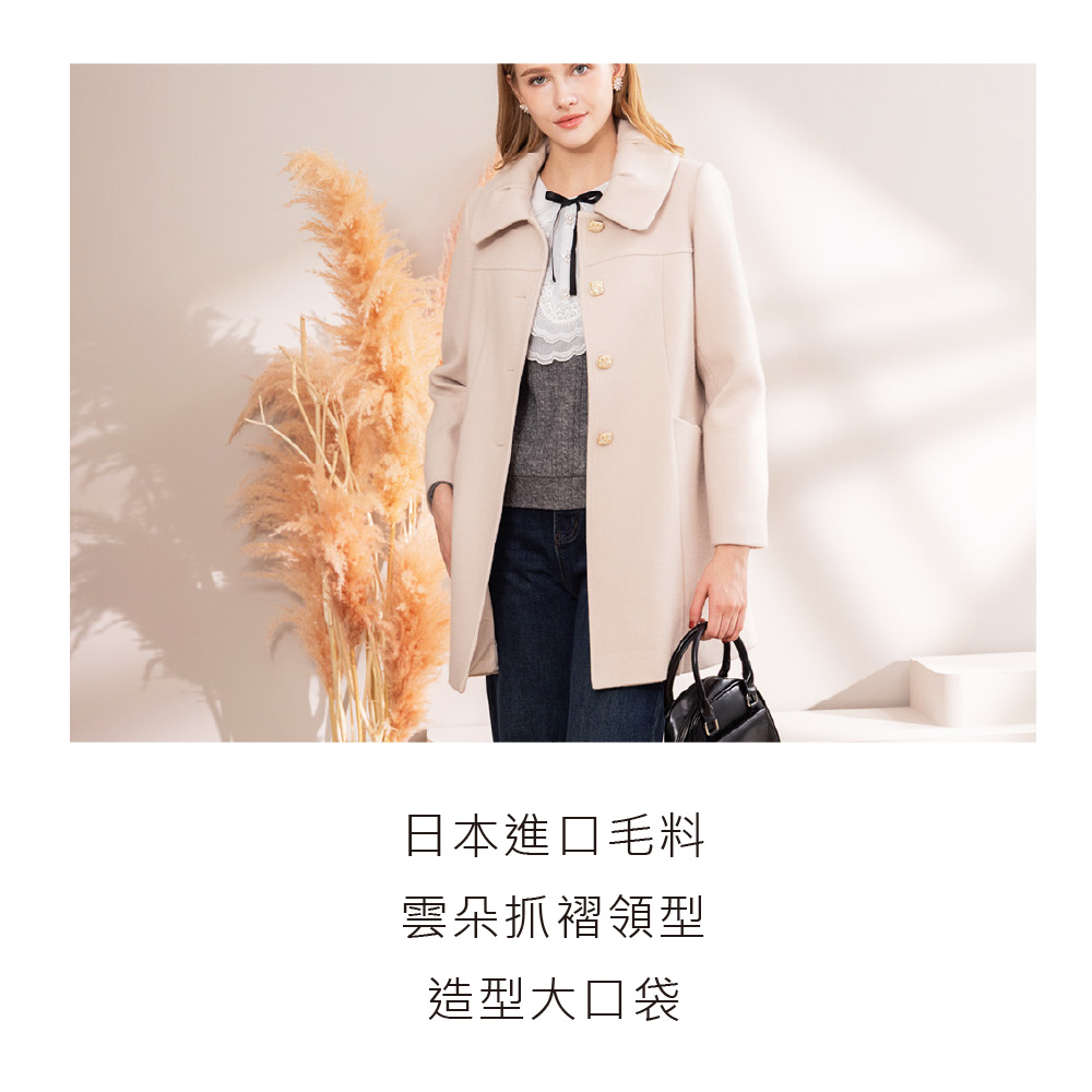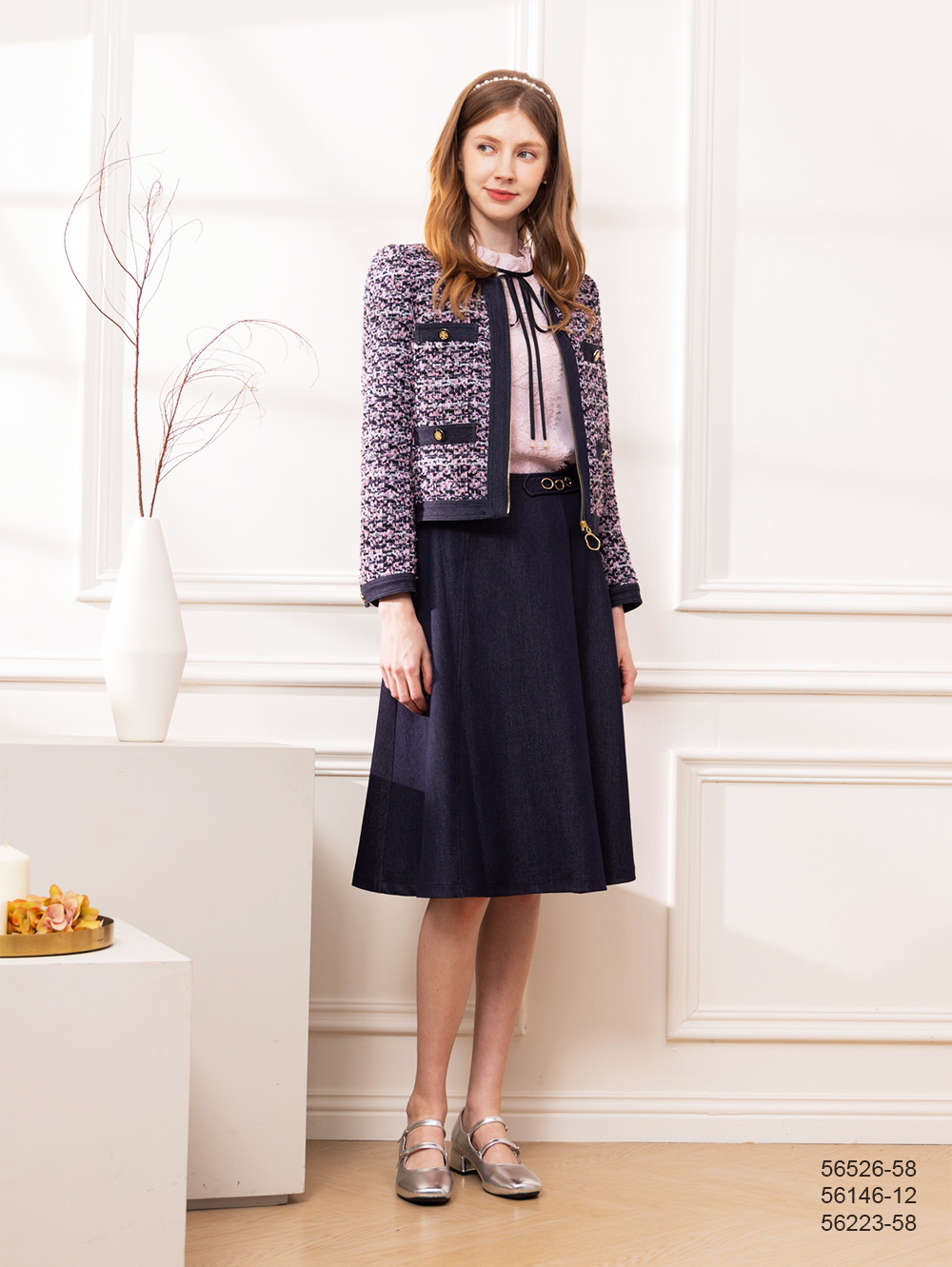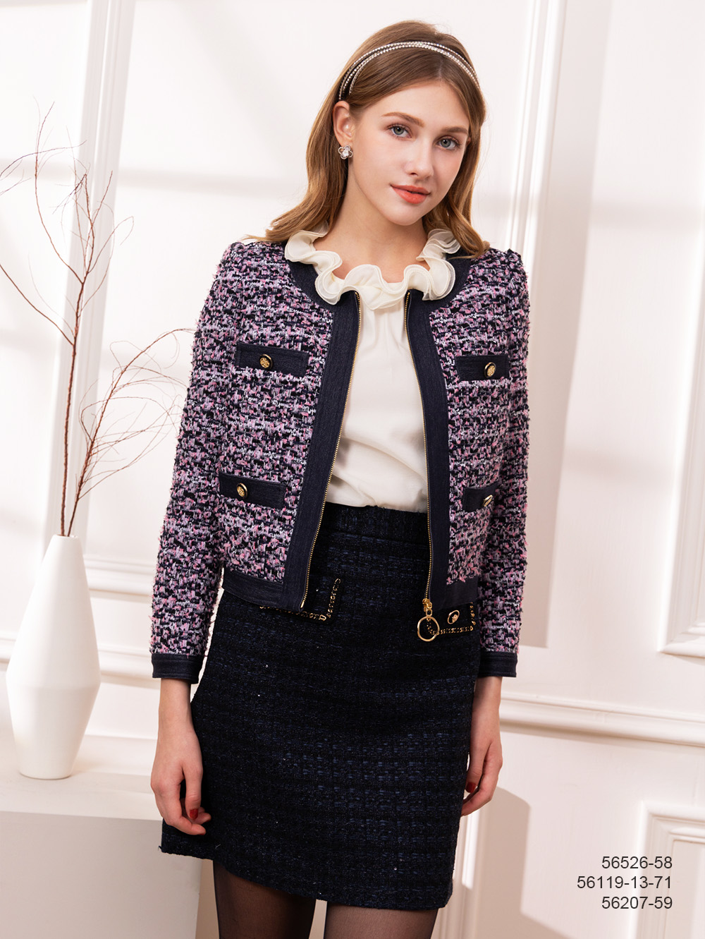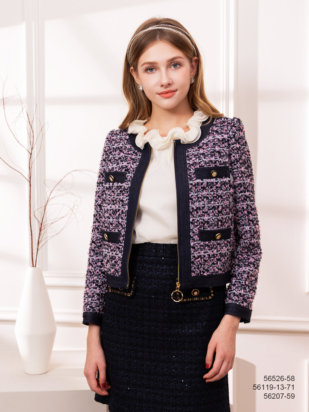 織紋粗呢面料 撞色裝飾織帶 細緻釦飾