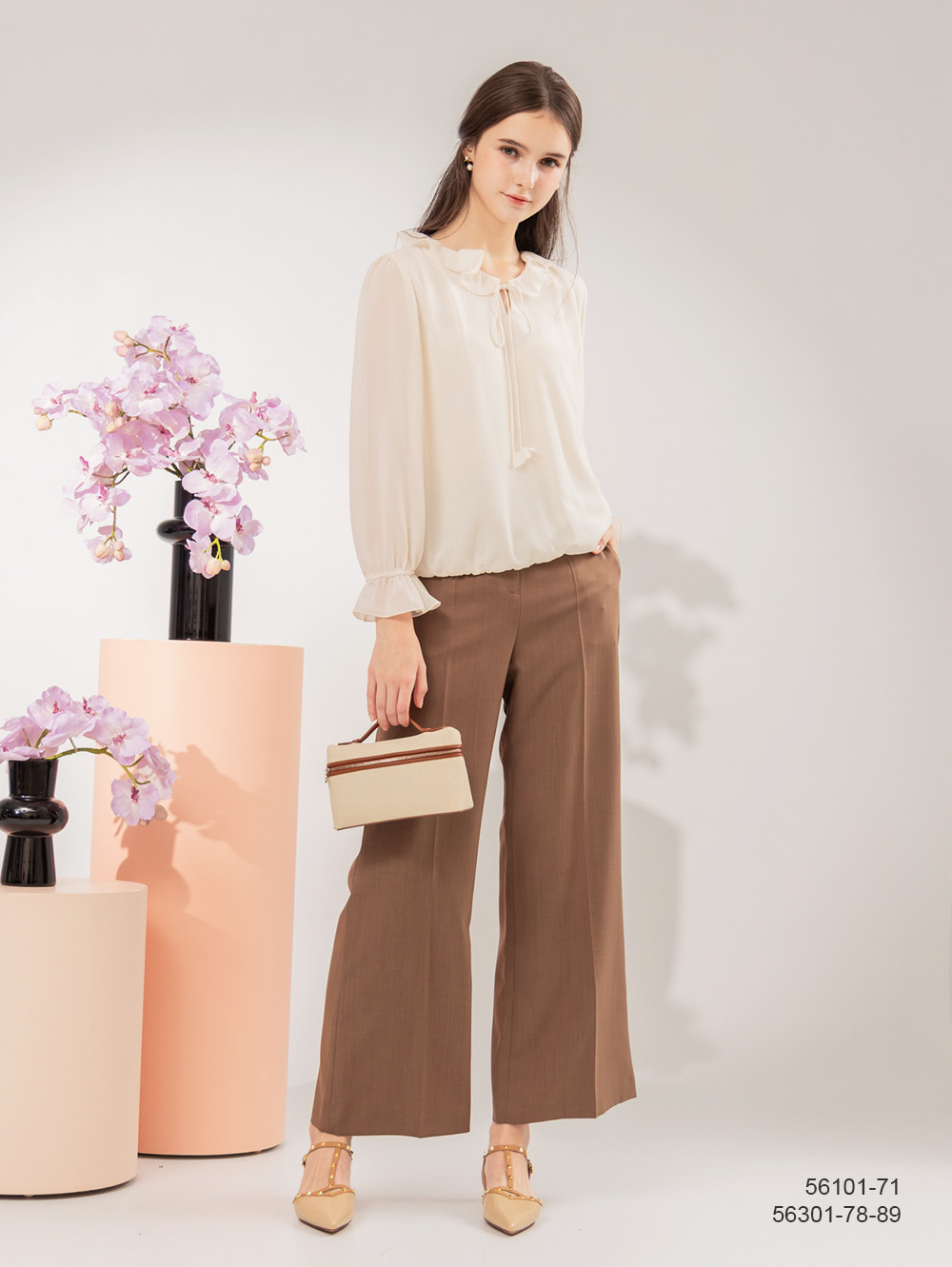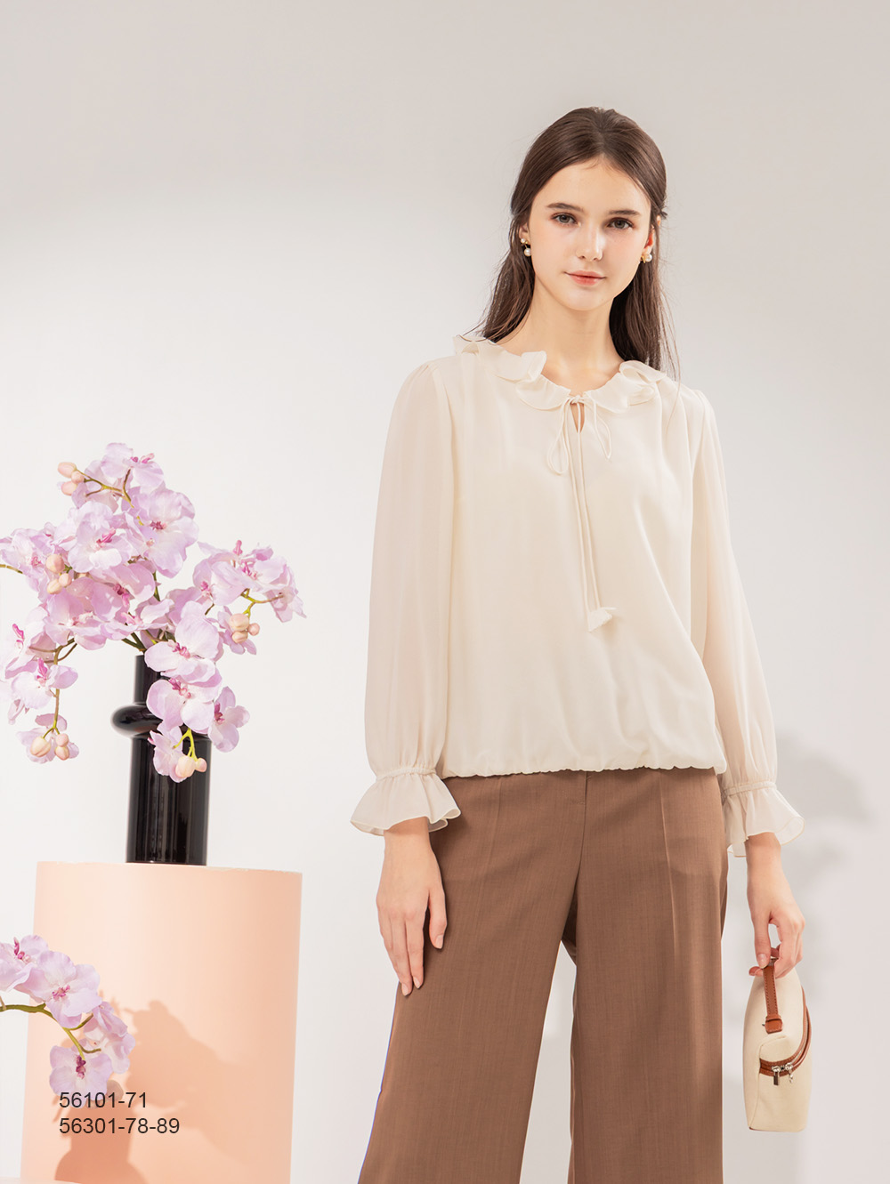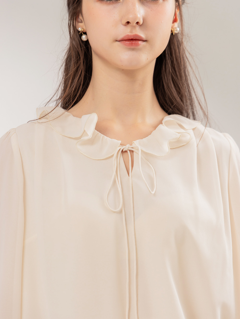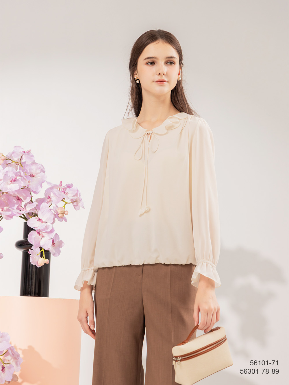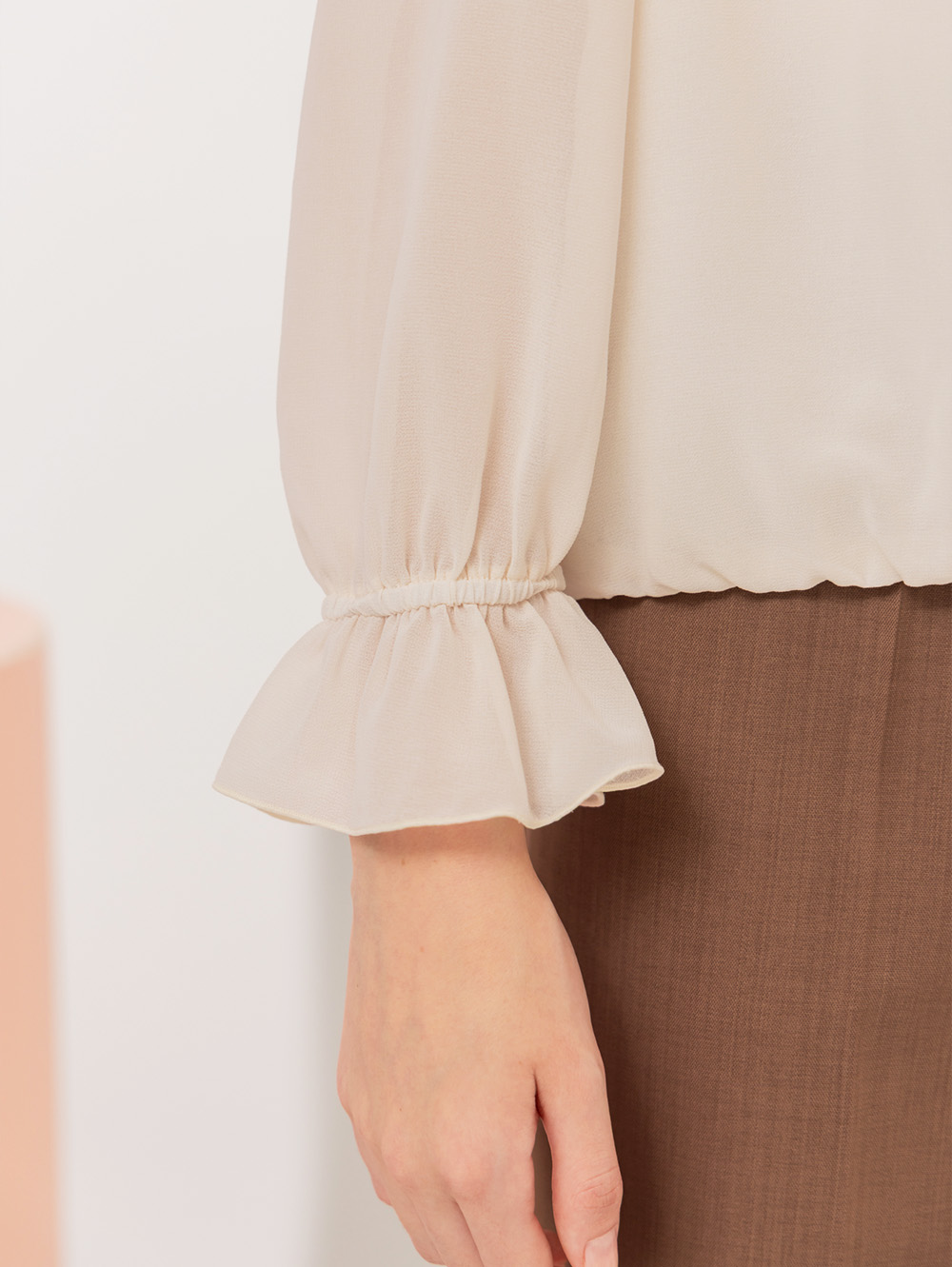 輕柔雪紡面料 浪漫荷葉裝飾 微高領鬆緊設計