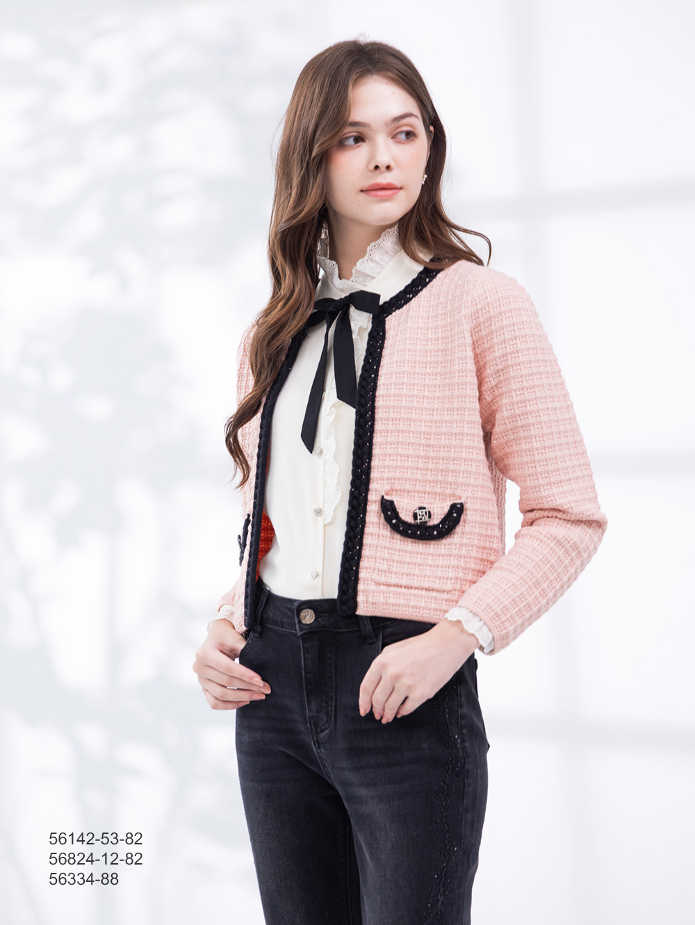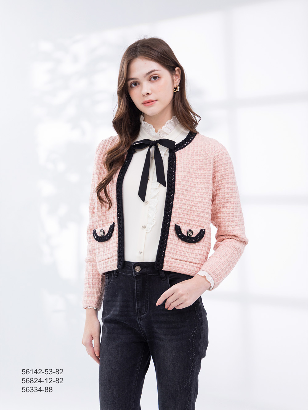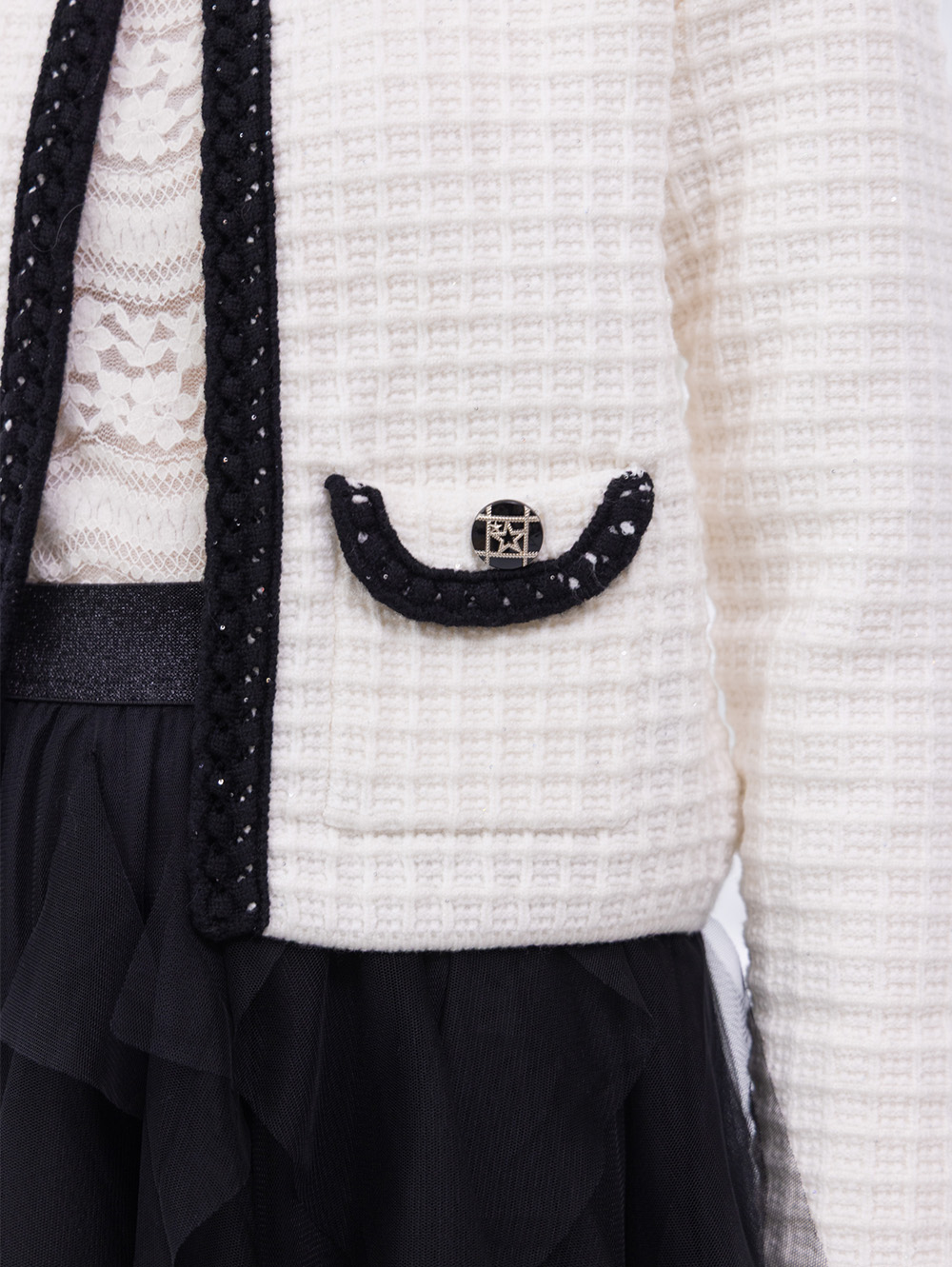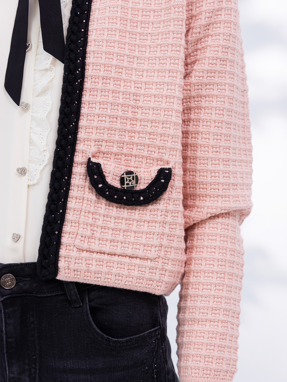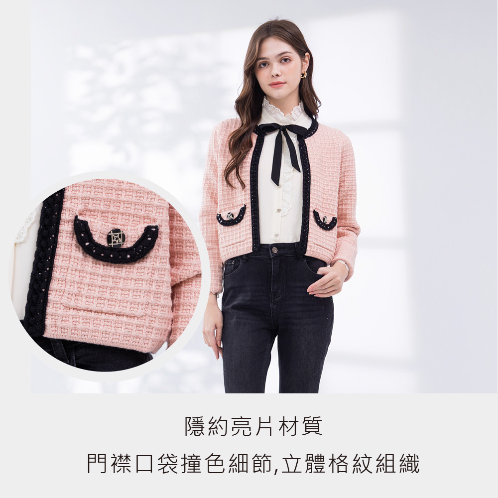 隱約亮片材質 門襟口袋撞色細節 立體格紋組織