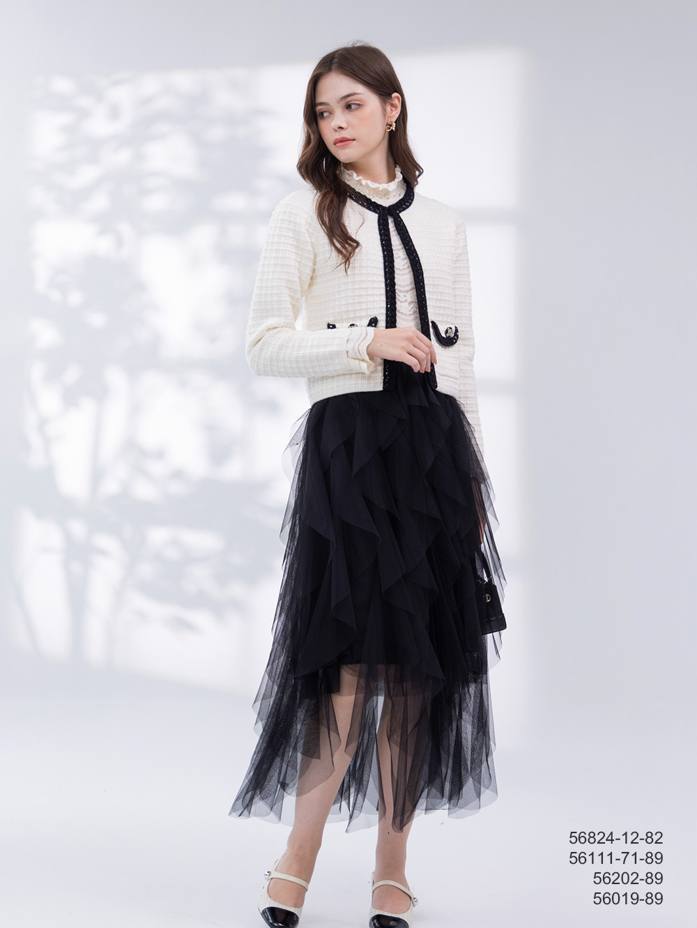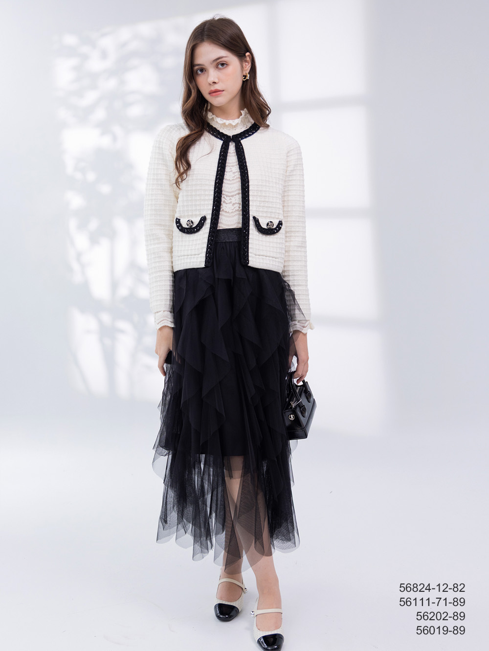 織紋粗呢面料 撞色織帶裝飾 裙擺百褶設計
