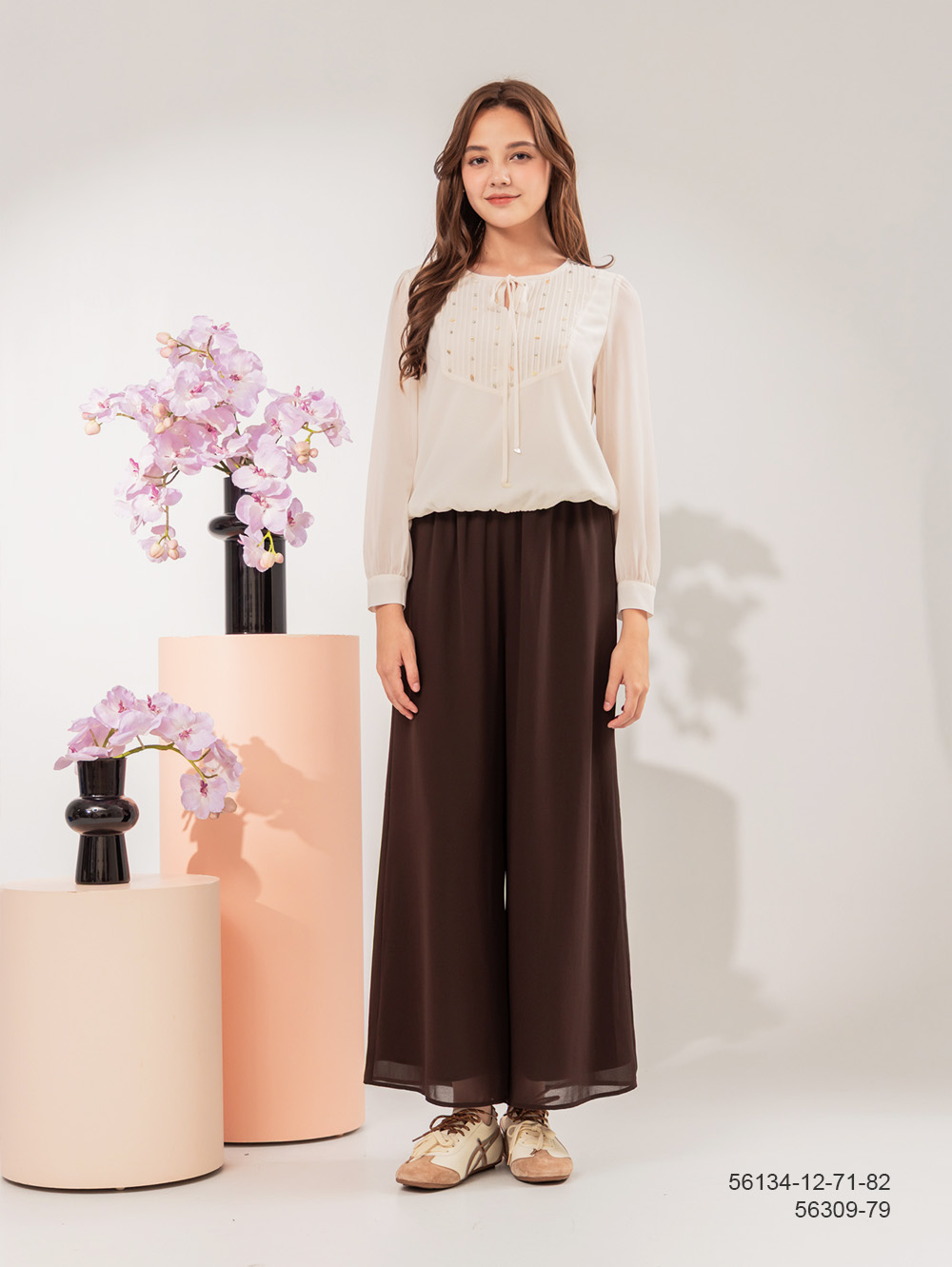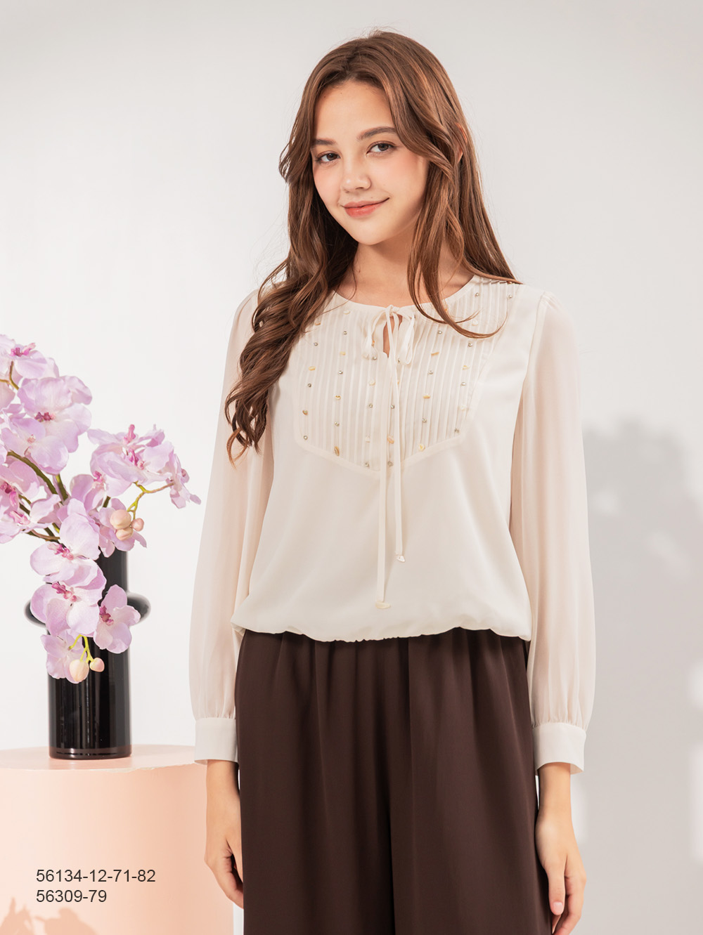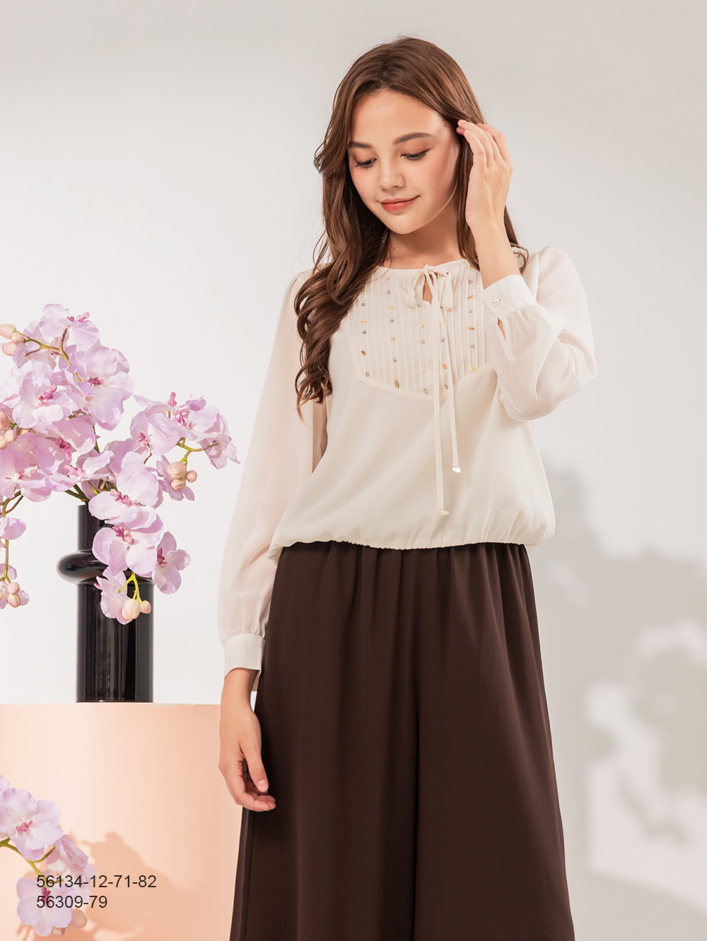 輕柔雪紡面料 領綁帶設計 壓褶裙身拼接