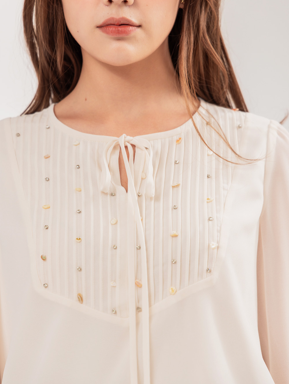 輕柔雪紡面料 蕾絲領設計 裝飾亮鑽
