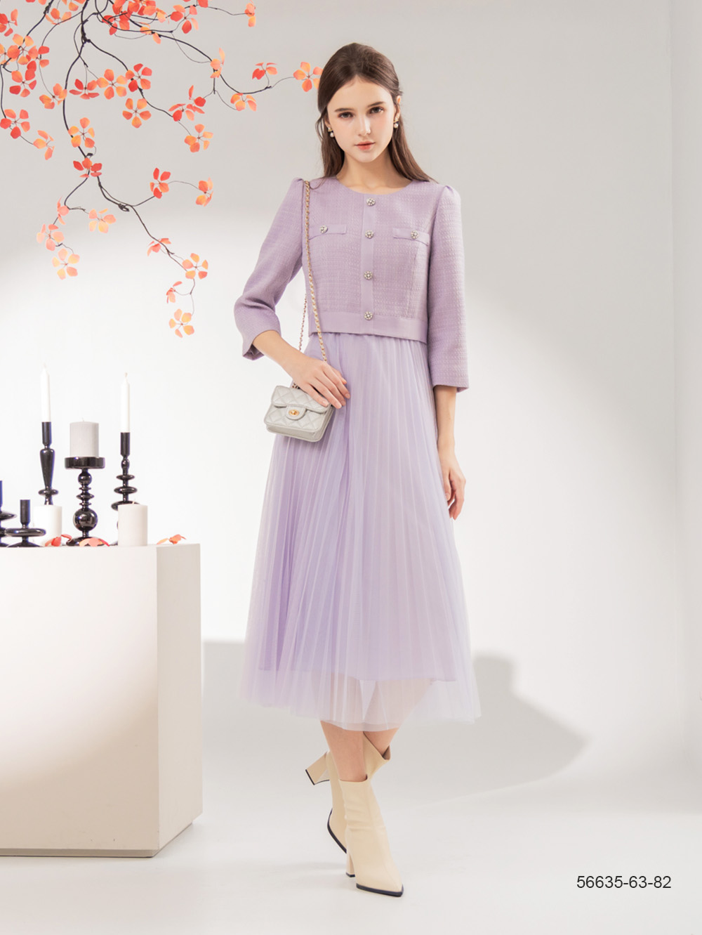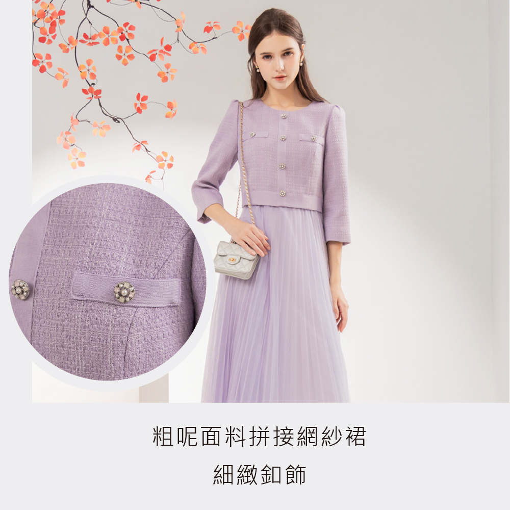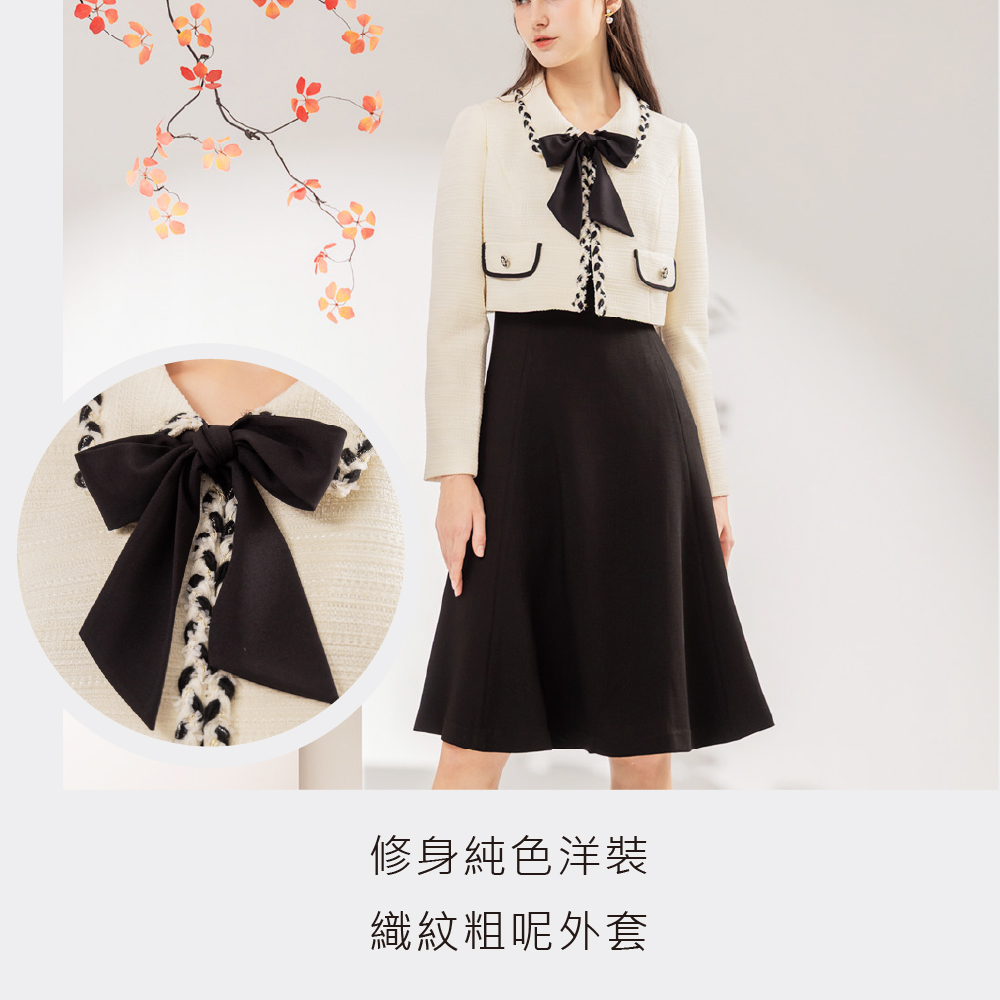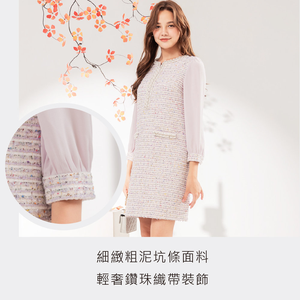 質感粗呢面料 氣質修身版型 裙身壓褶設計 附腰帶