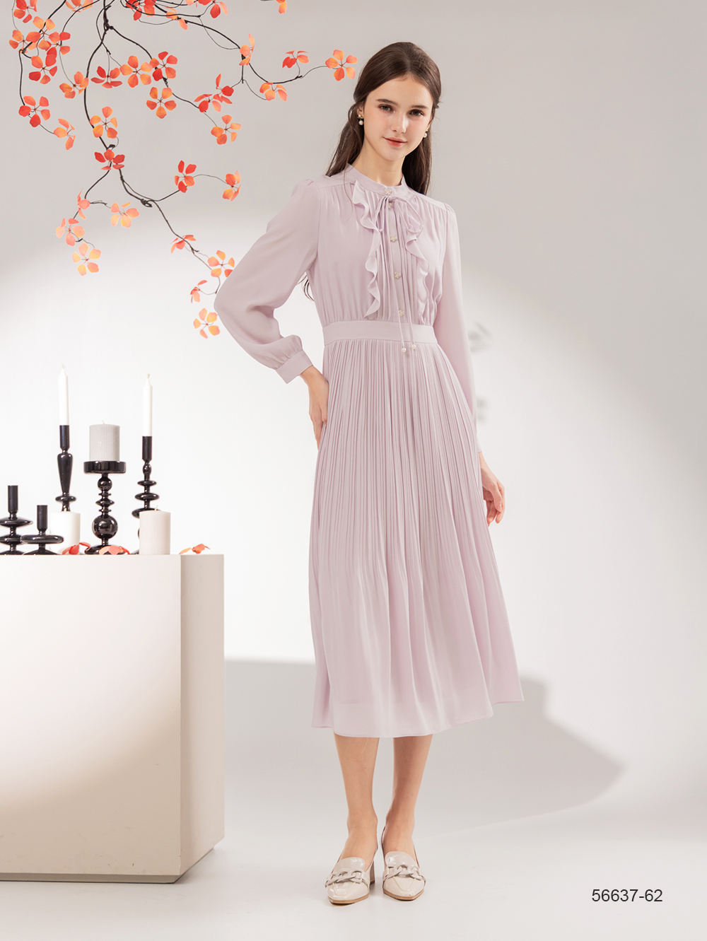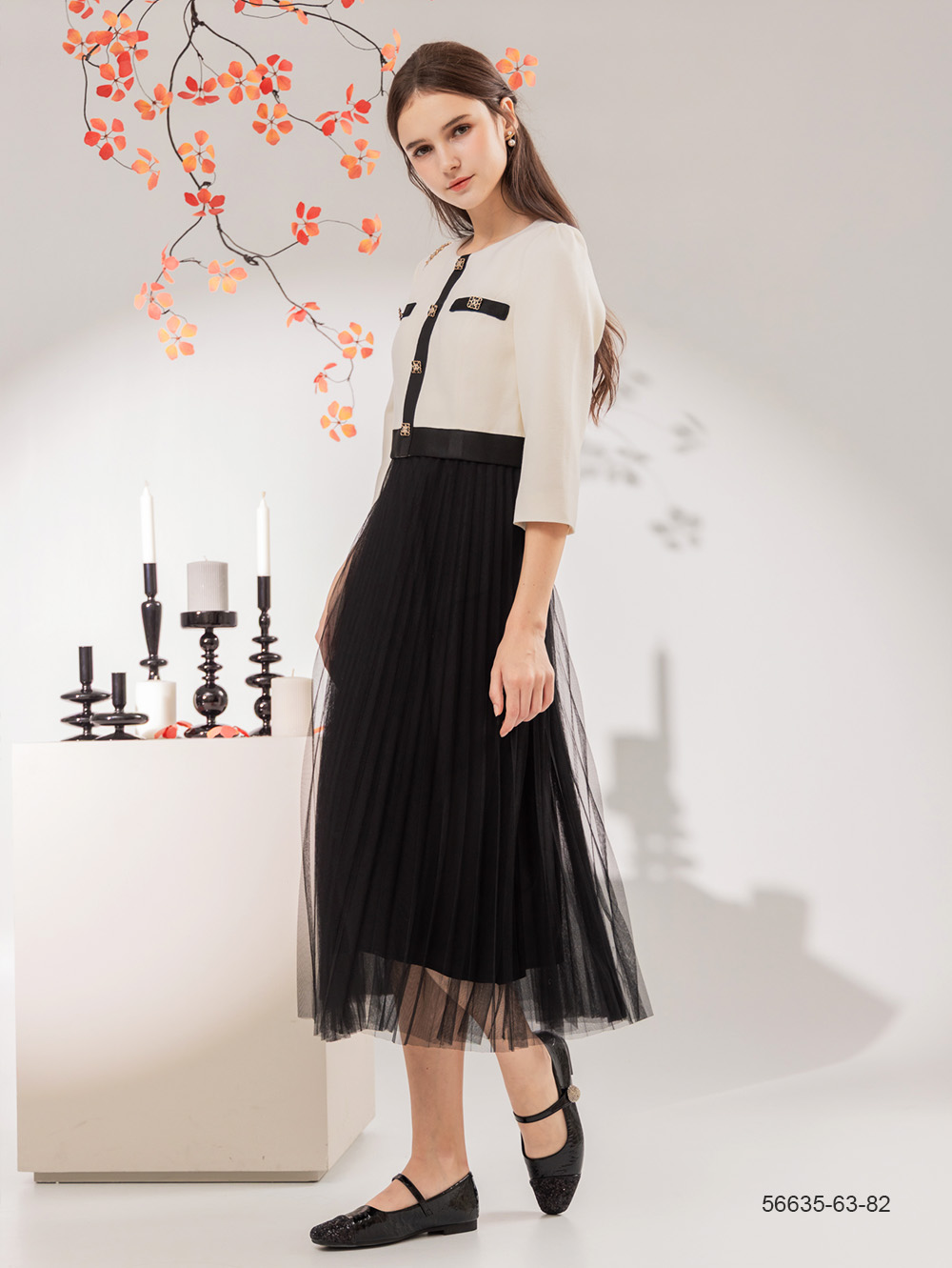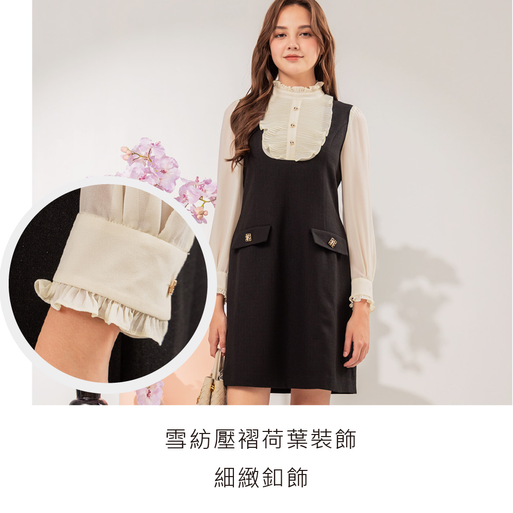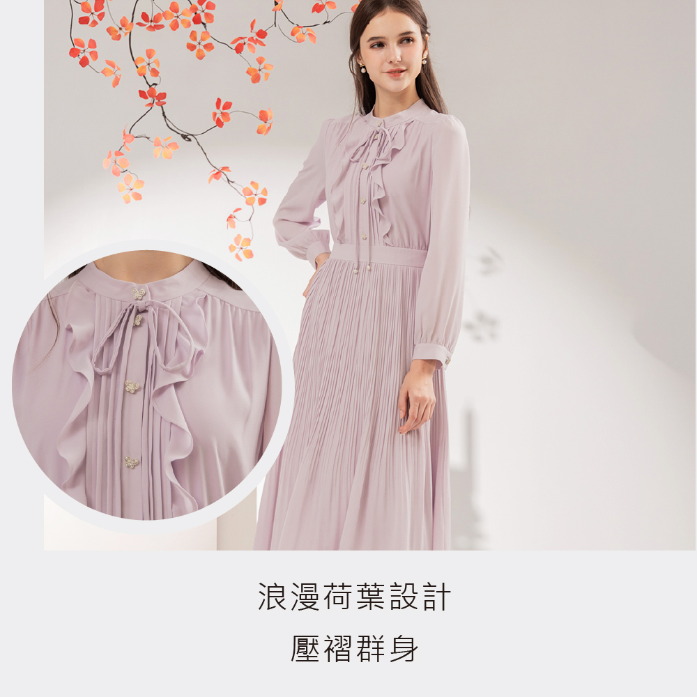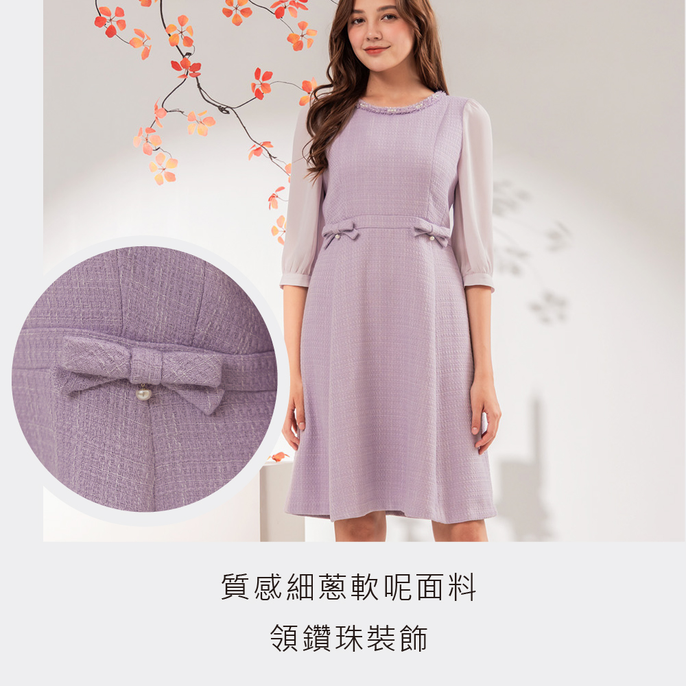 質感格紋印花面料 領綁帶設計 鬆緊帶腰身 裙襬壓褶設計