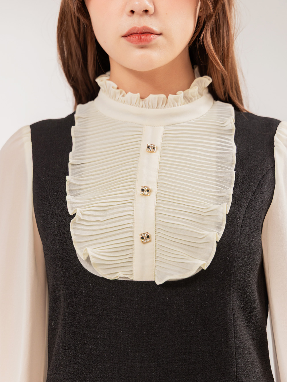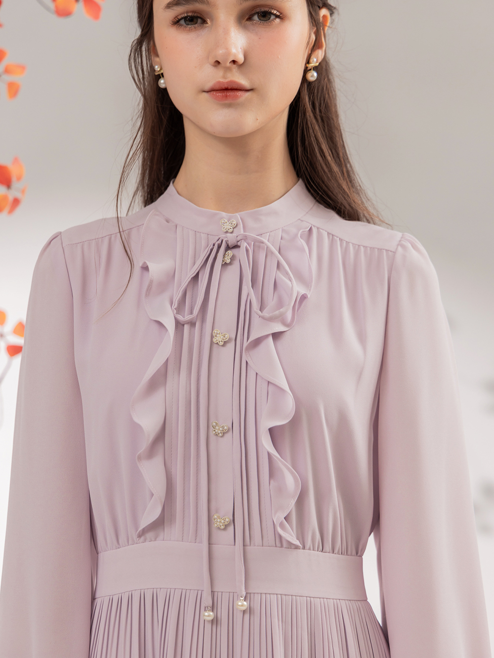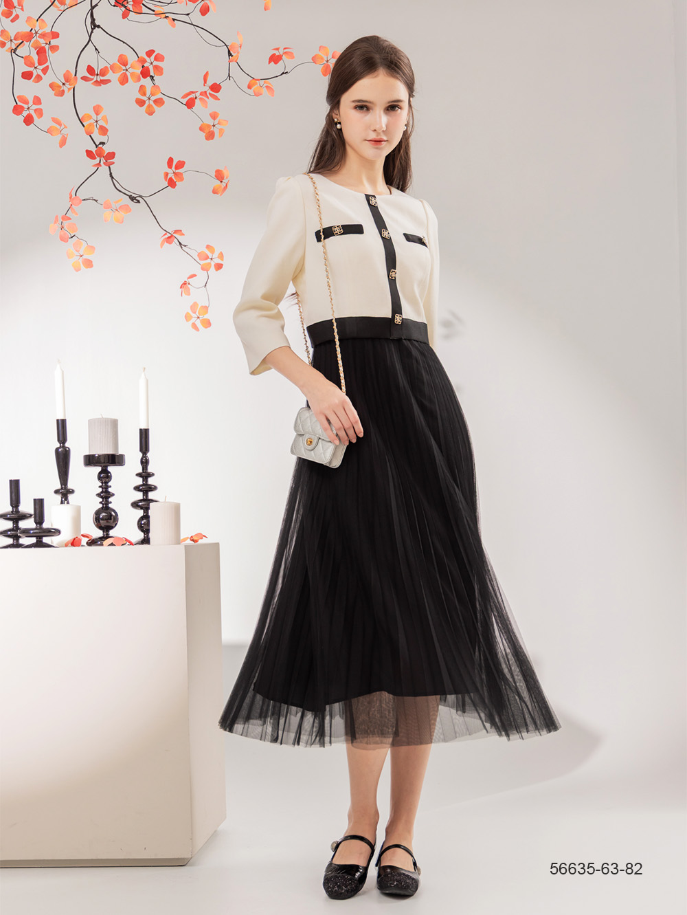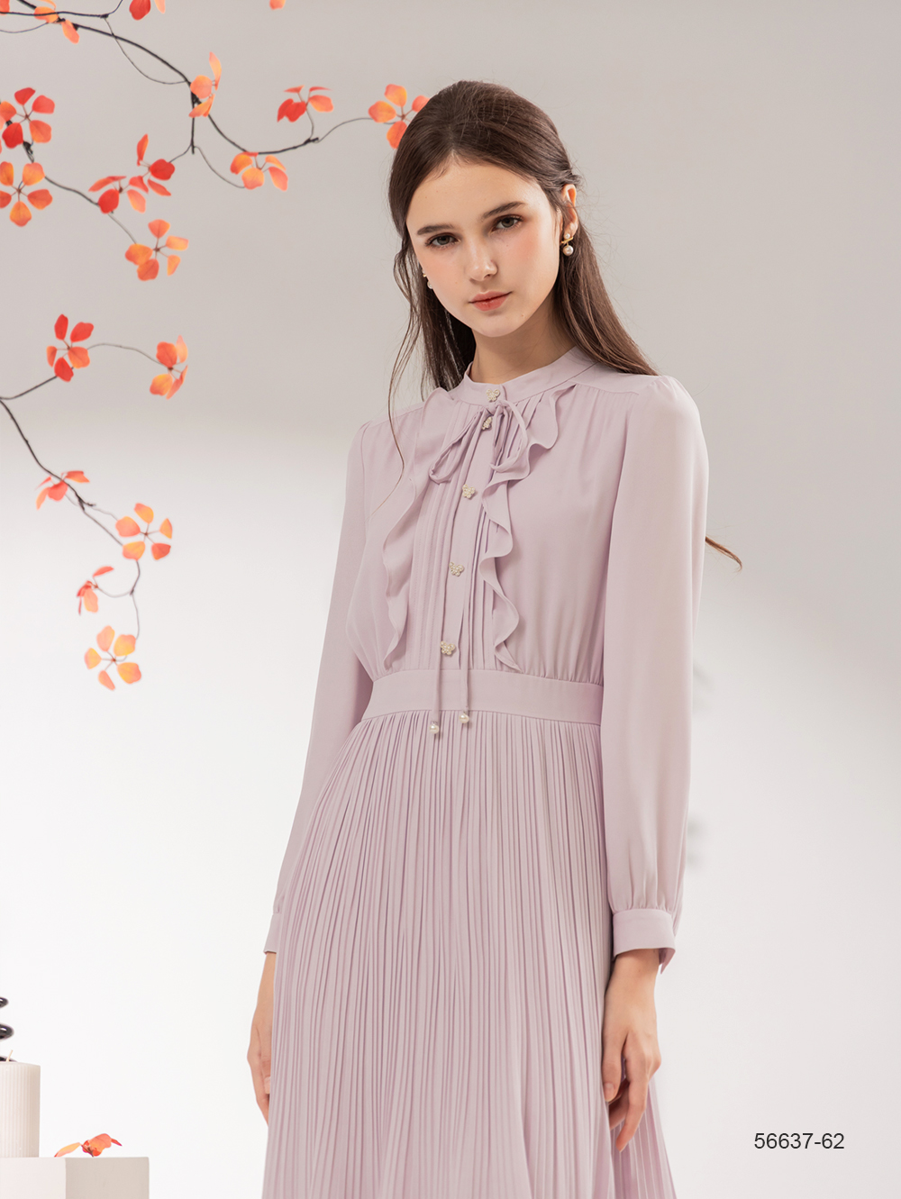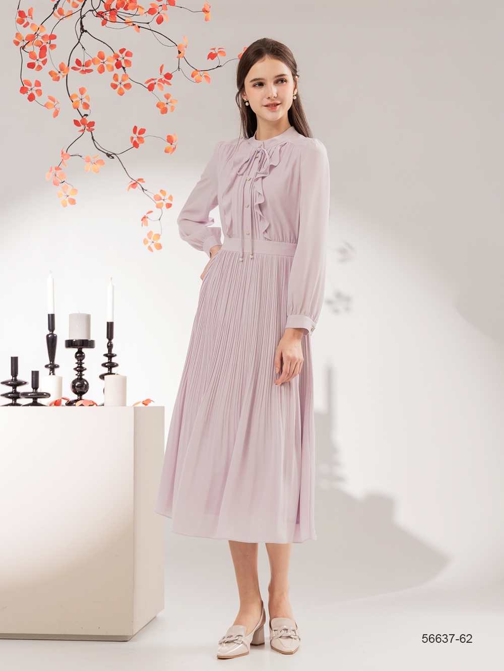 質感格紋印花面料 領綁帶設計 鬆緊帶腰身 裙襬壓褶設計