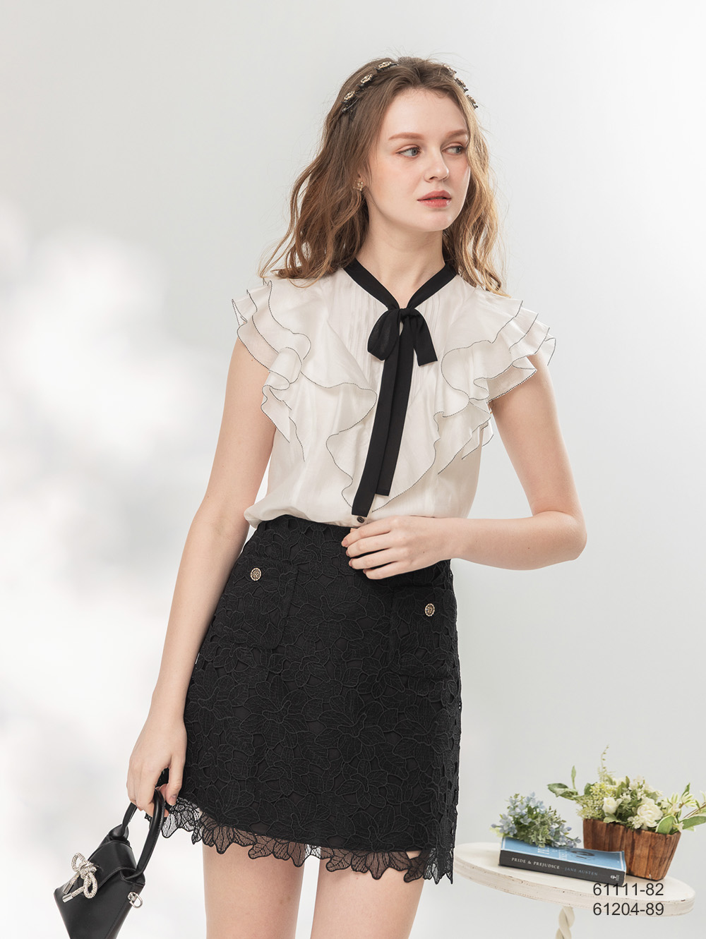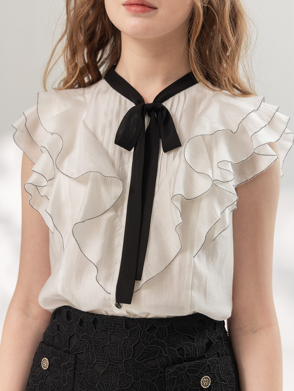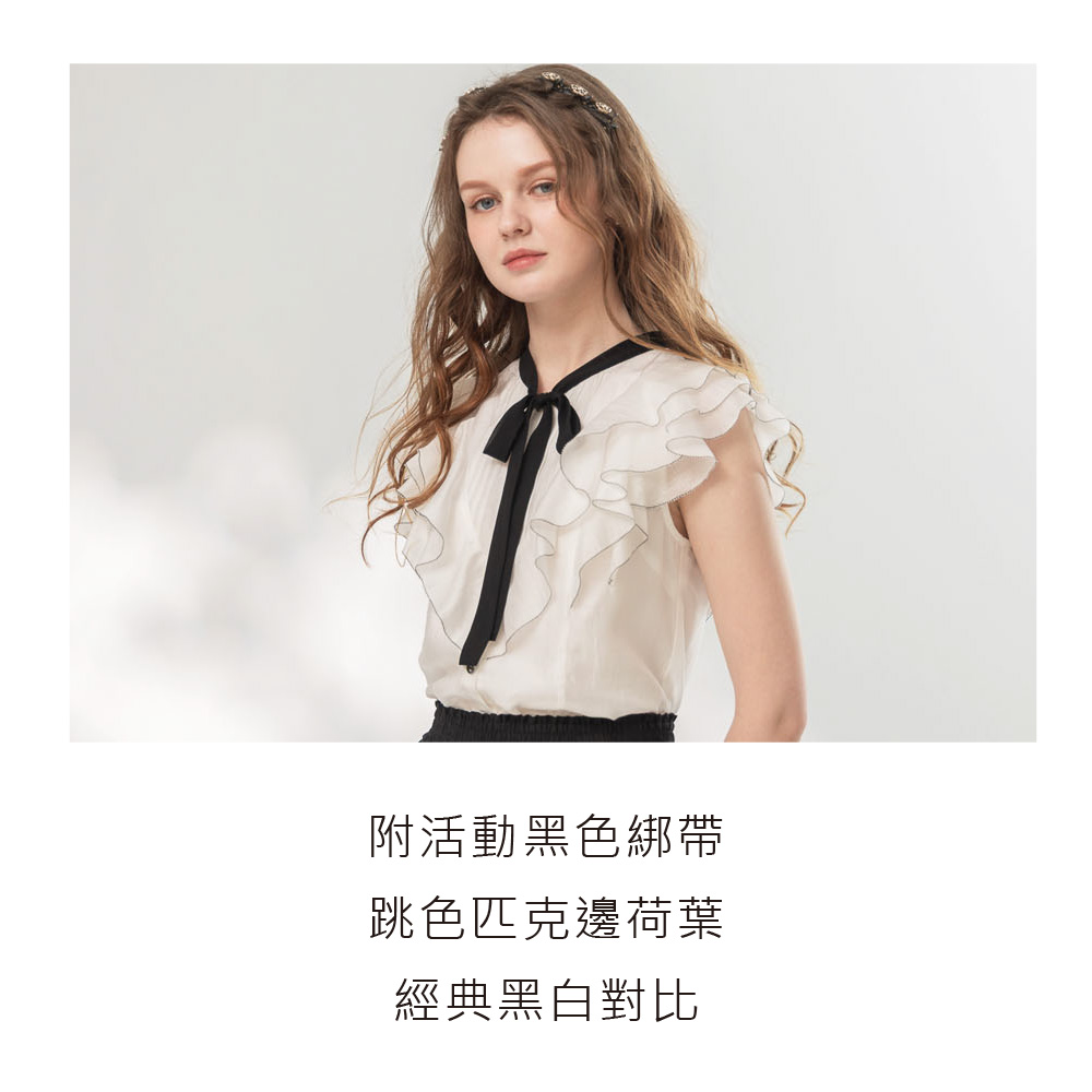 附活動黑色綁帶 跳色匹克邊荷葉 經典黑白對比 名媛學院氣質