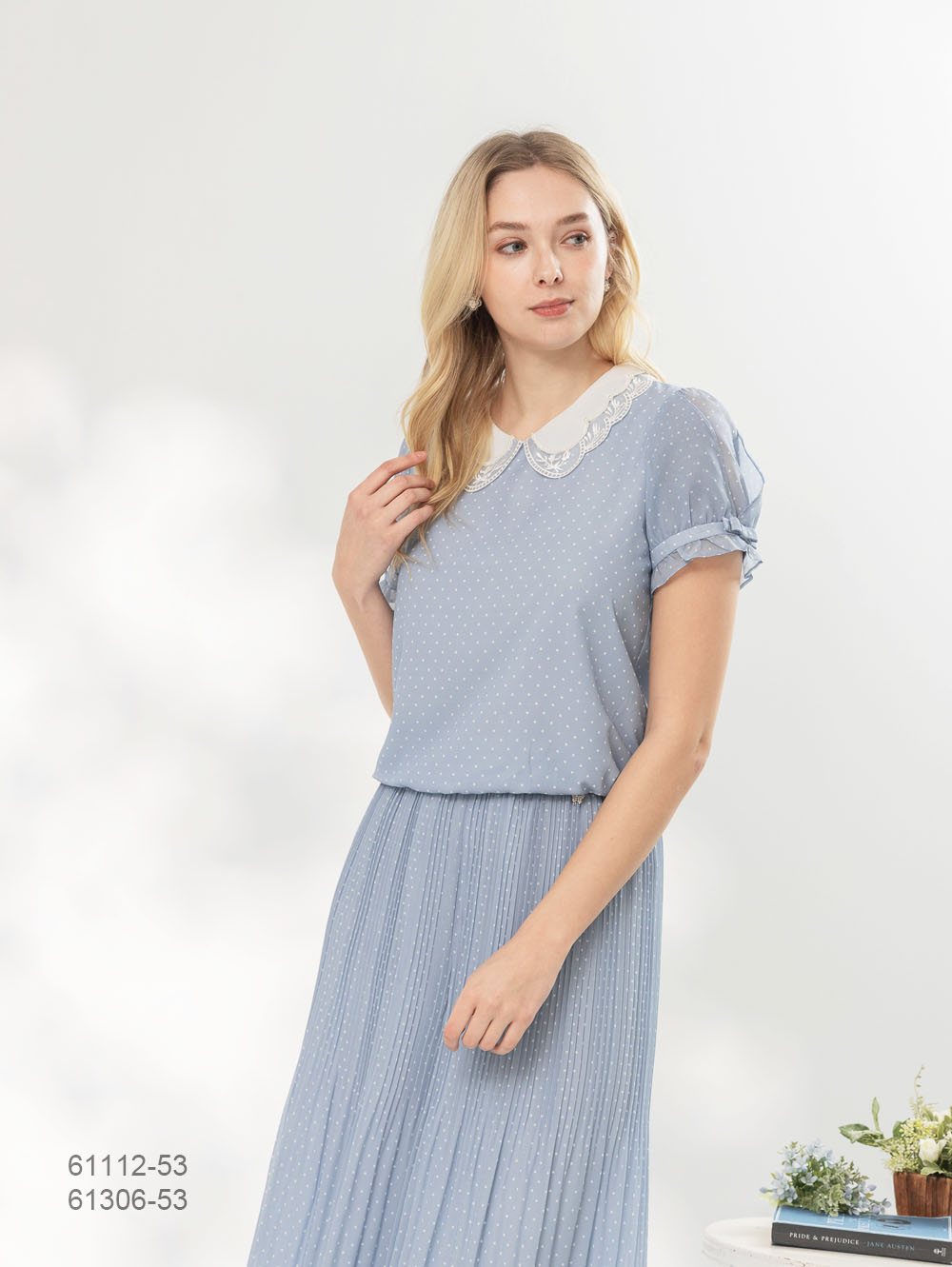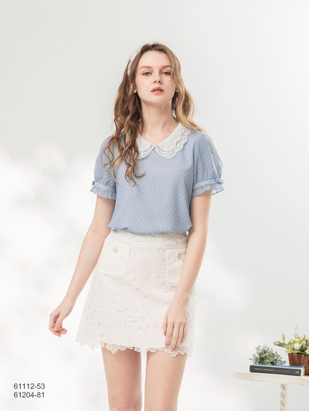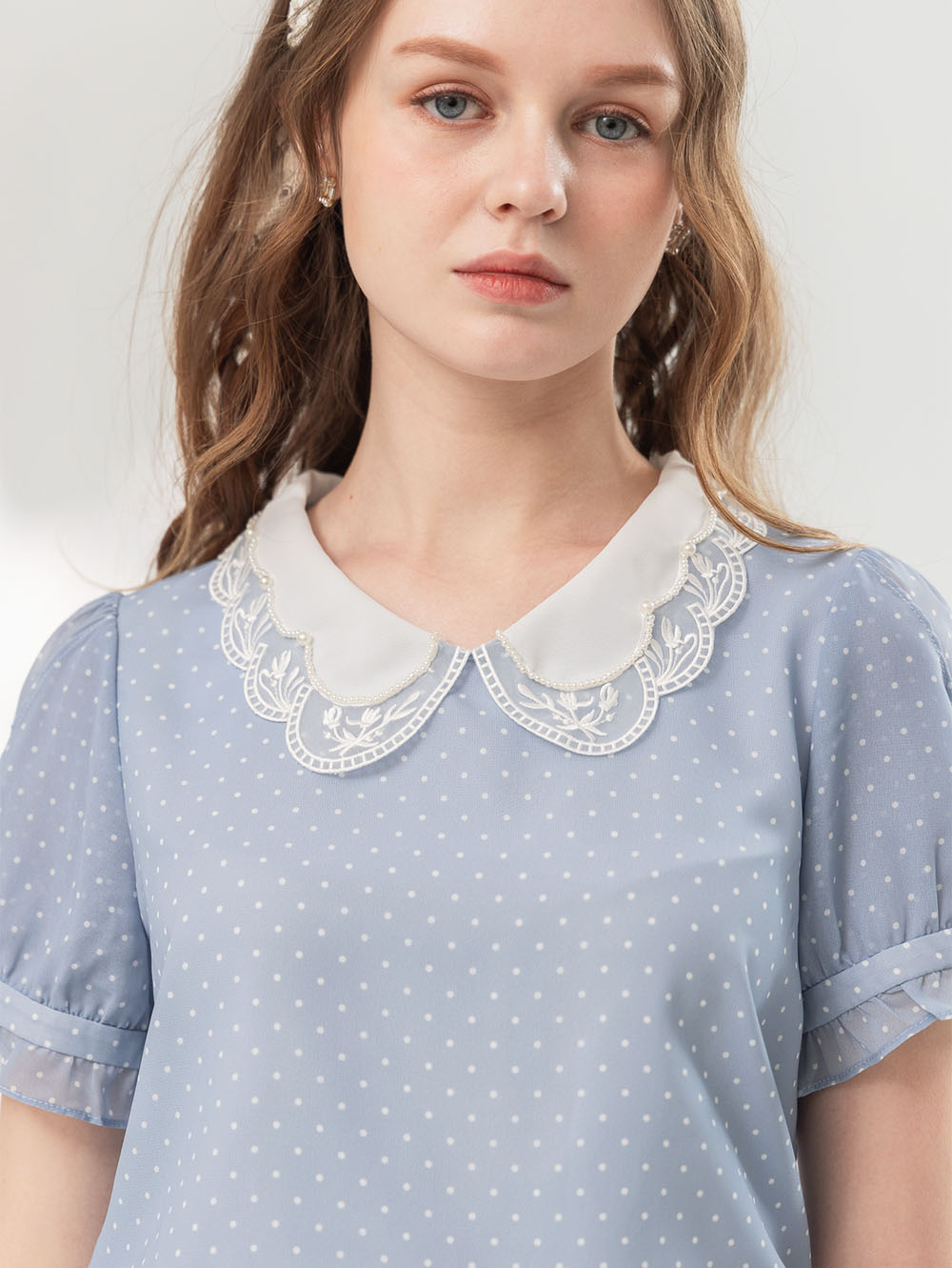 精緻蕾絲刺繡領片 霧藍細膩波點印花 柔甜少女氣息