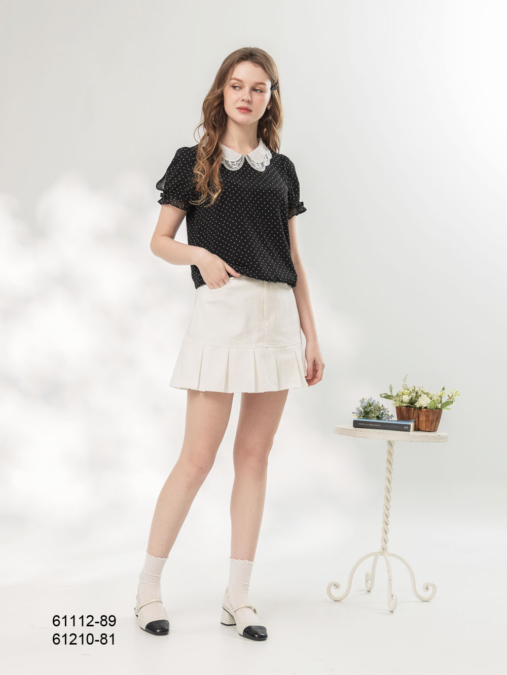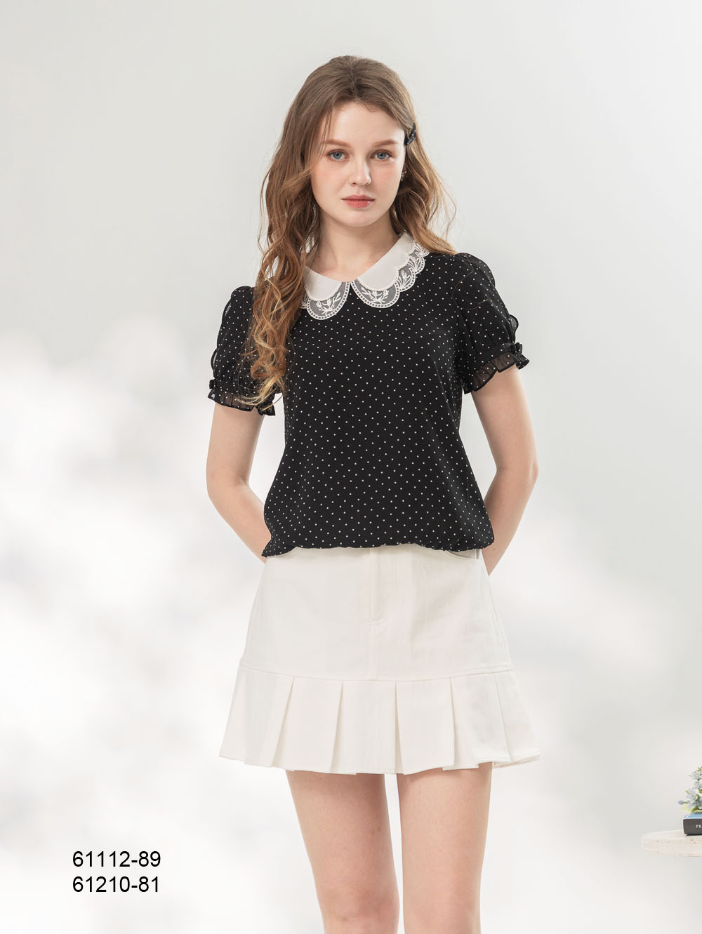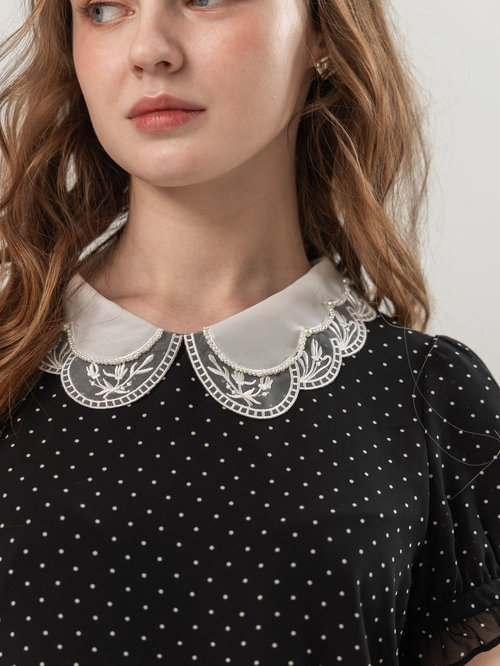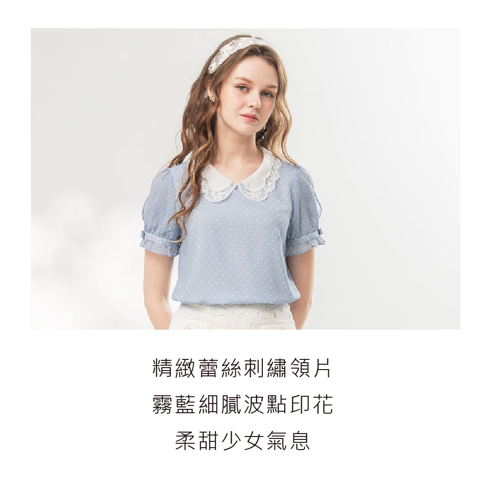 精緻蕾絲刺繡領片 霧藍細膩波點印花 柔甜少女氣息