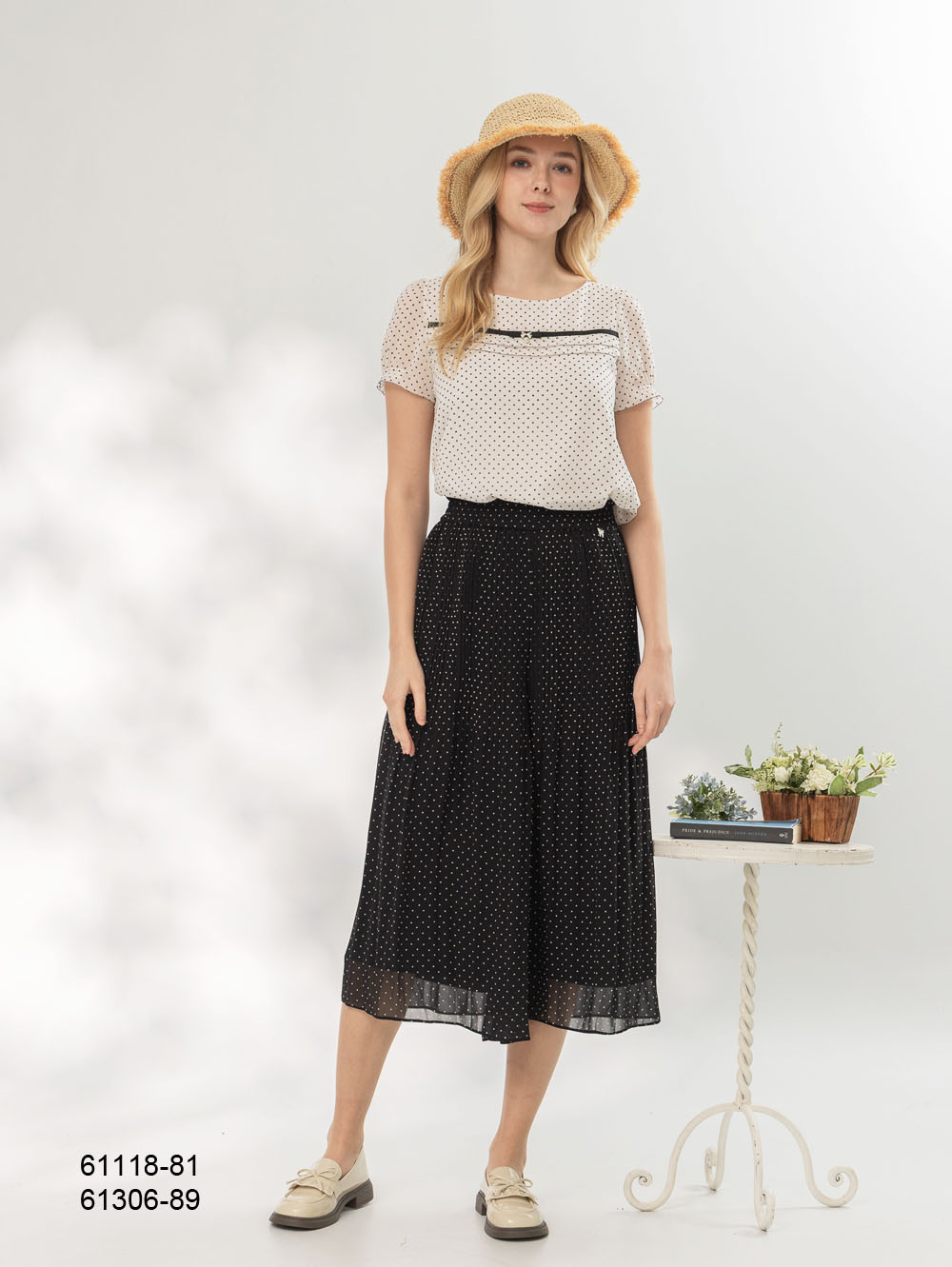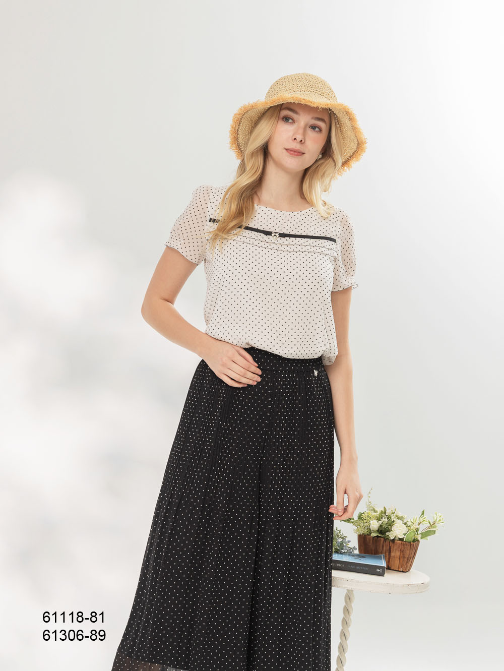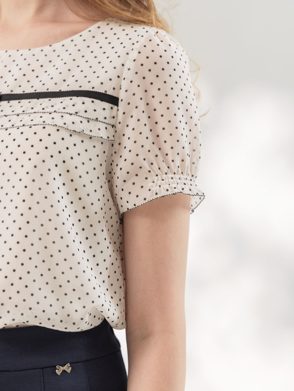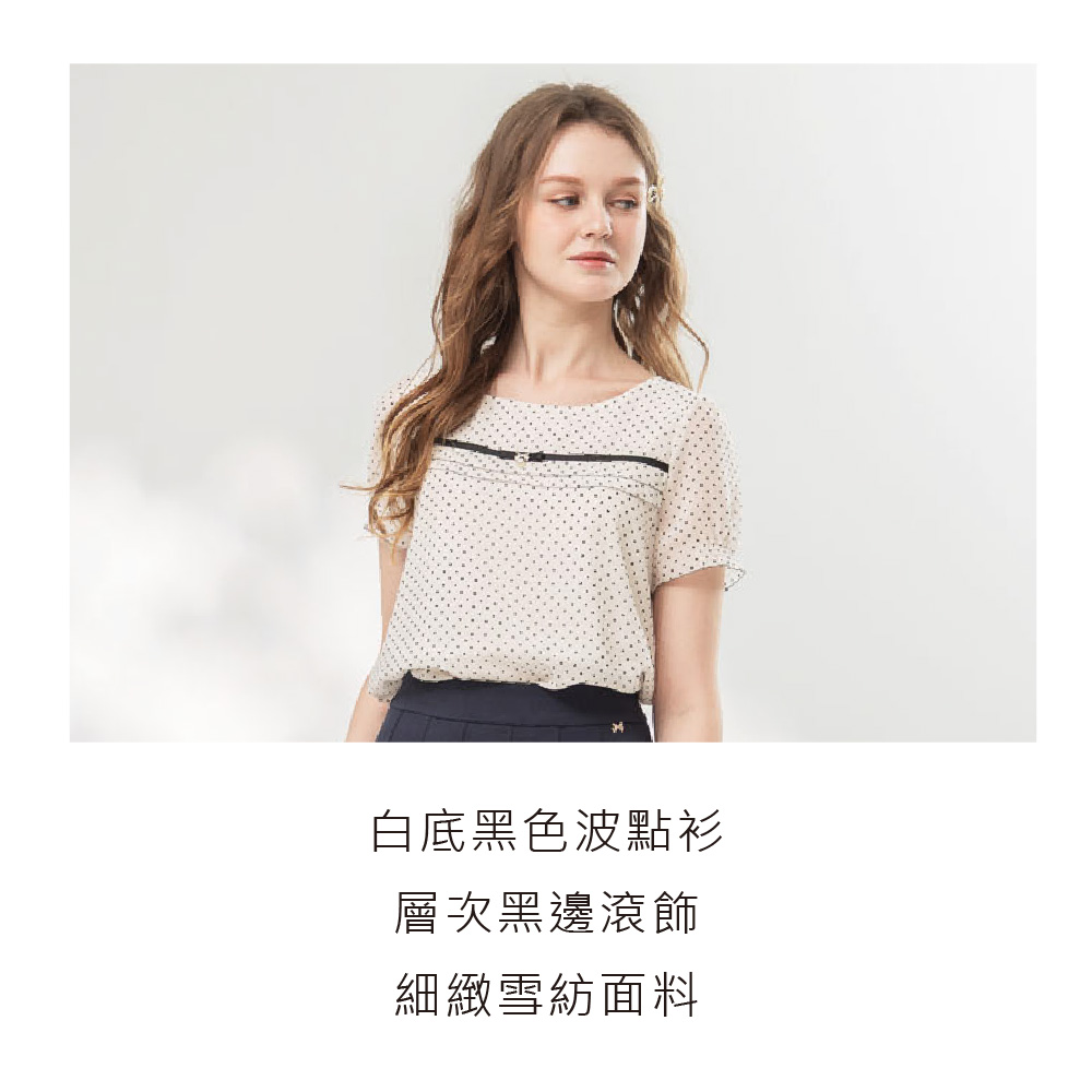 白底黑色波點衫 層次黑邊滾飾 細緻雪紡面料