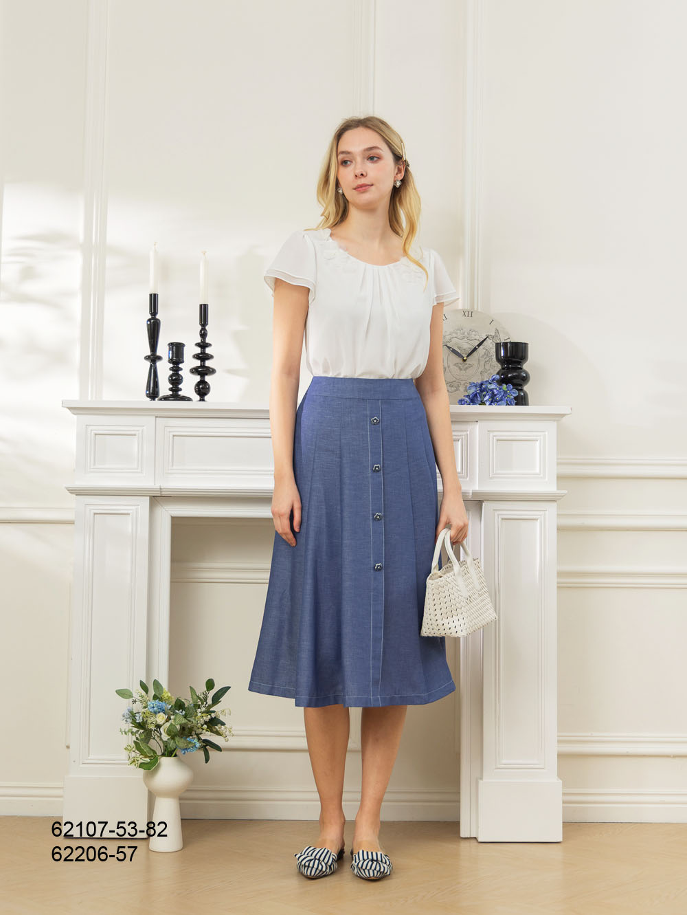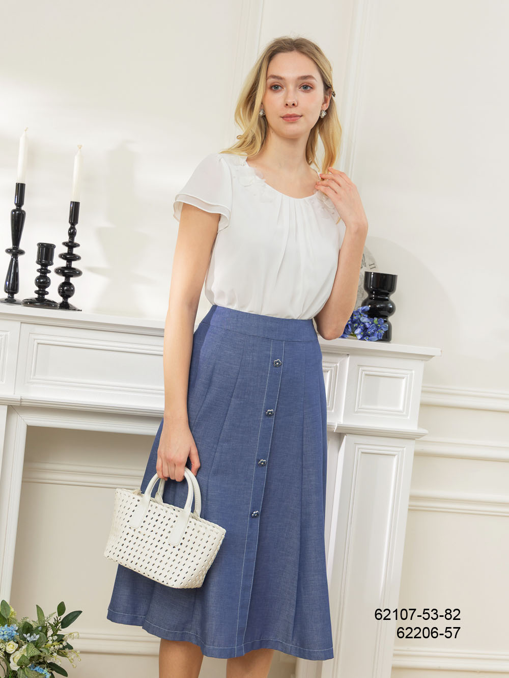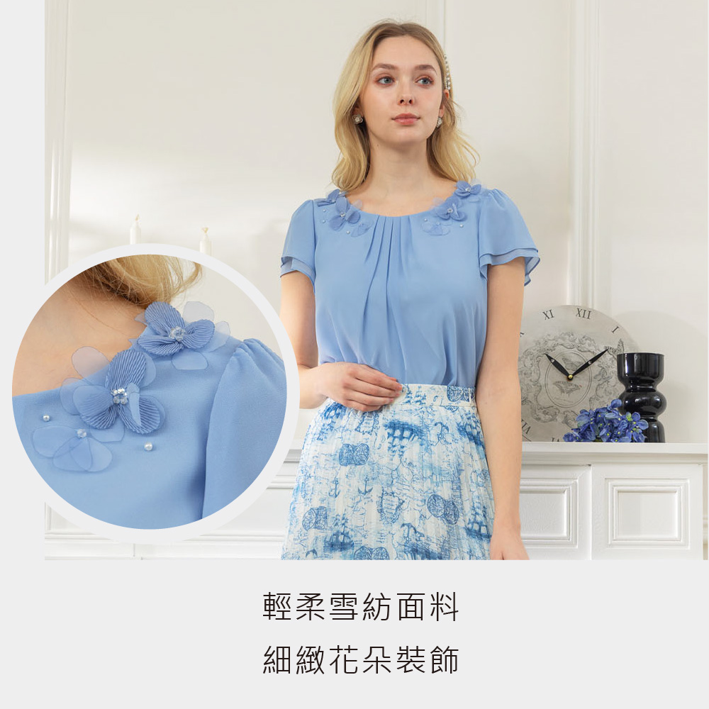清雅雪紡花飾上衣-藍色