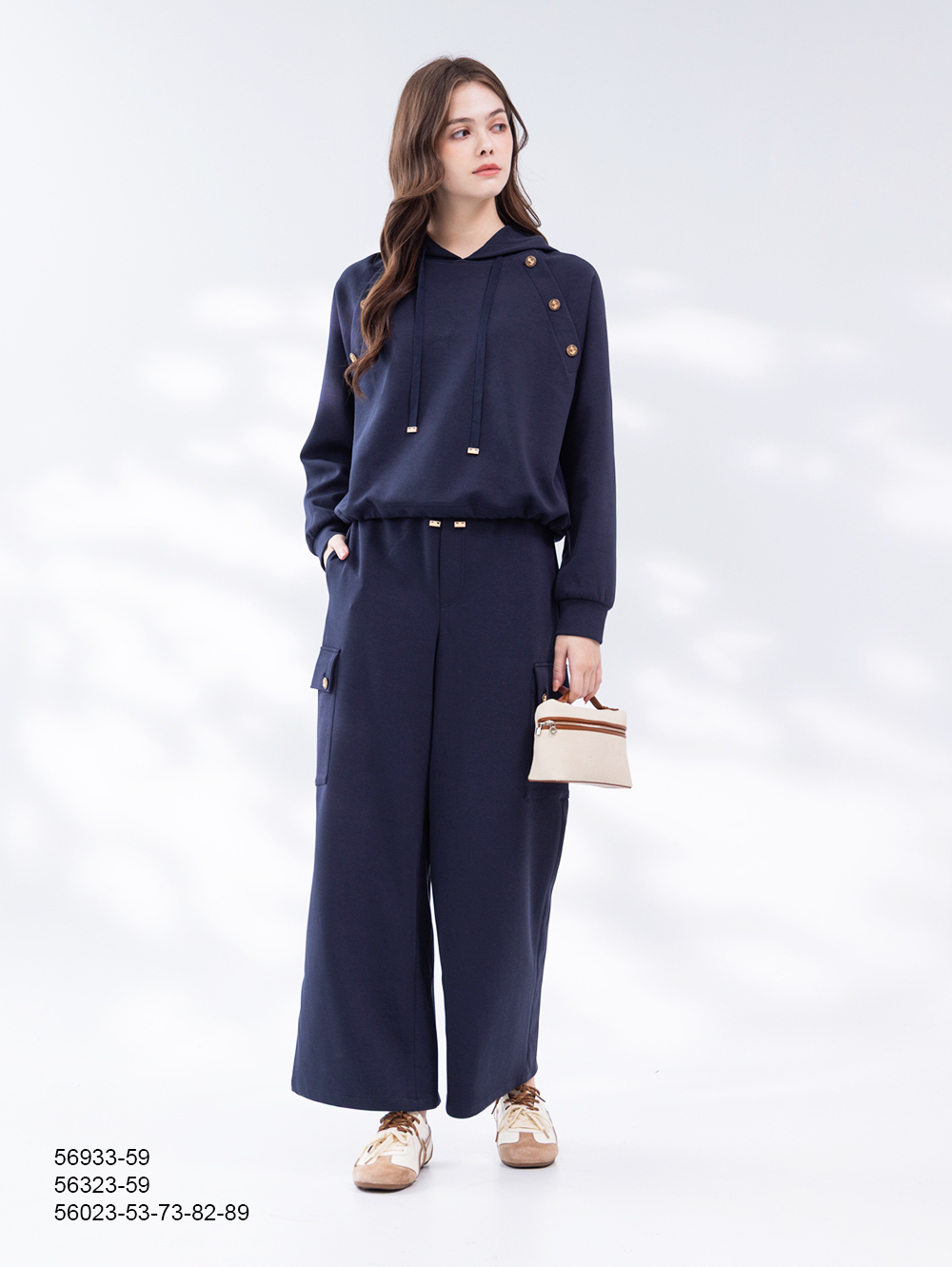 舒適棉面料 鬆緊帶腰身.腰部調節繩 側暗袋.造型貼袋設計 可與56933成套穿搭