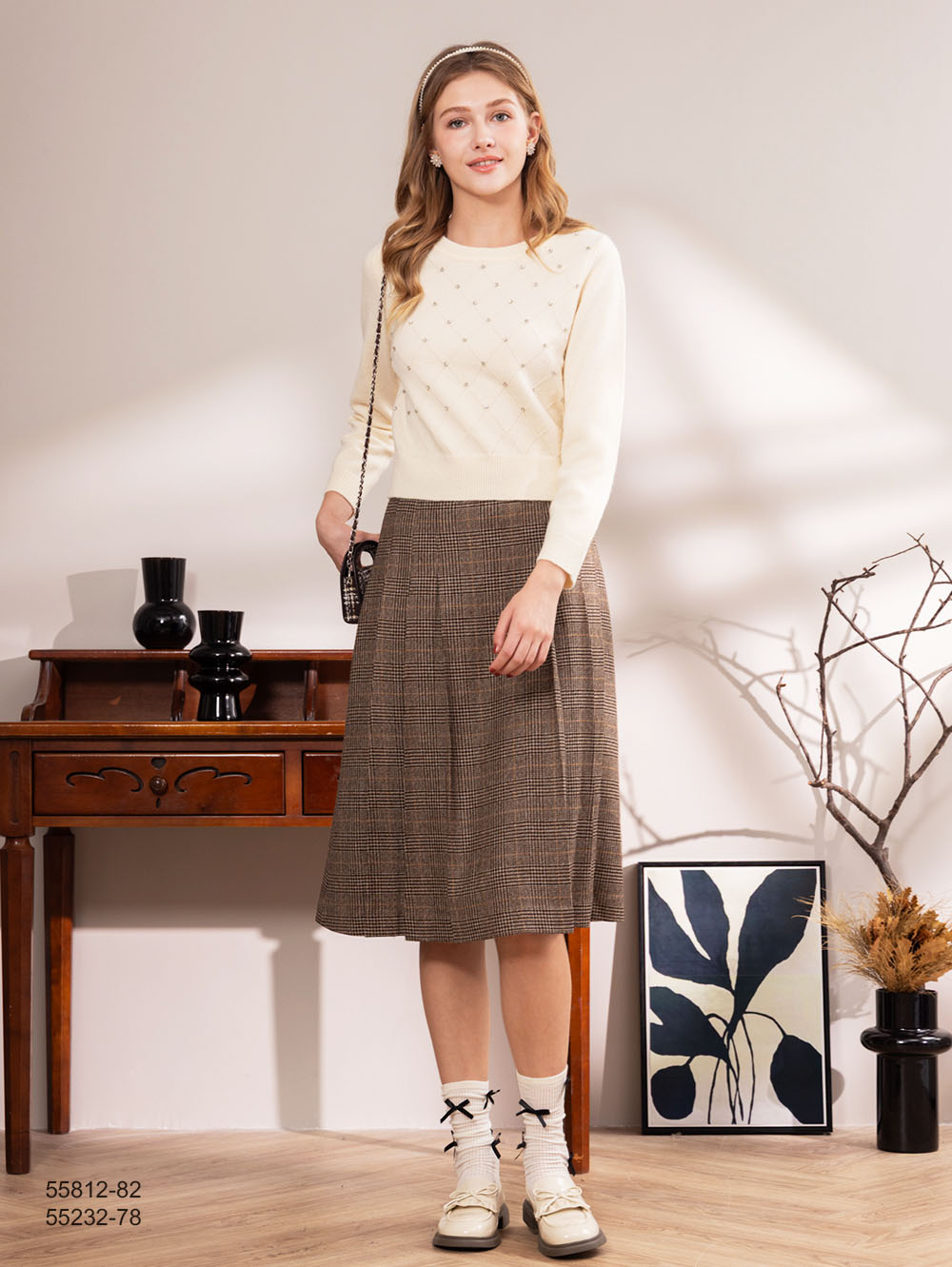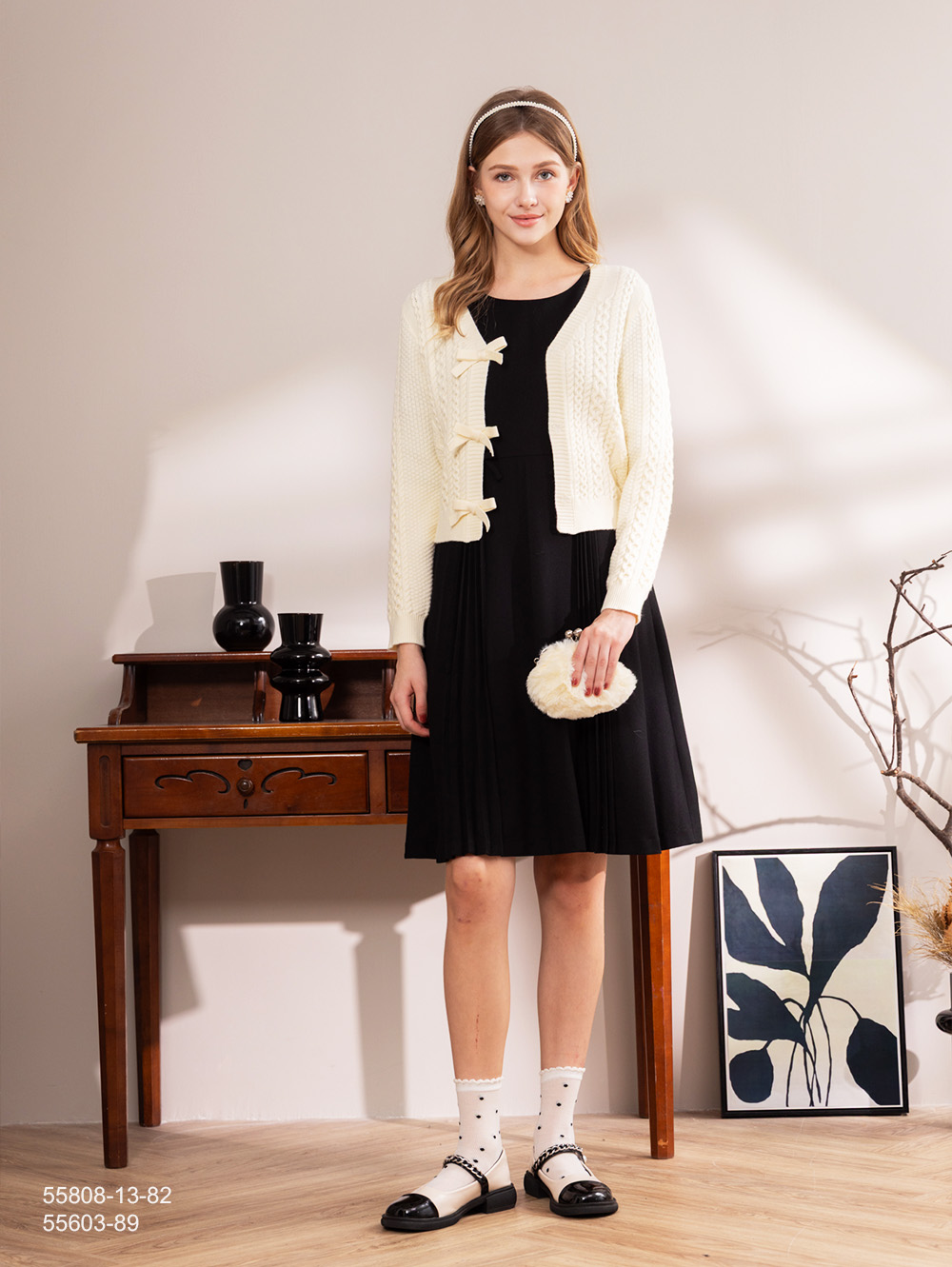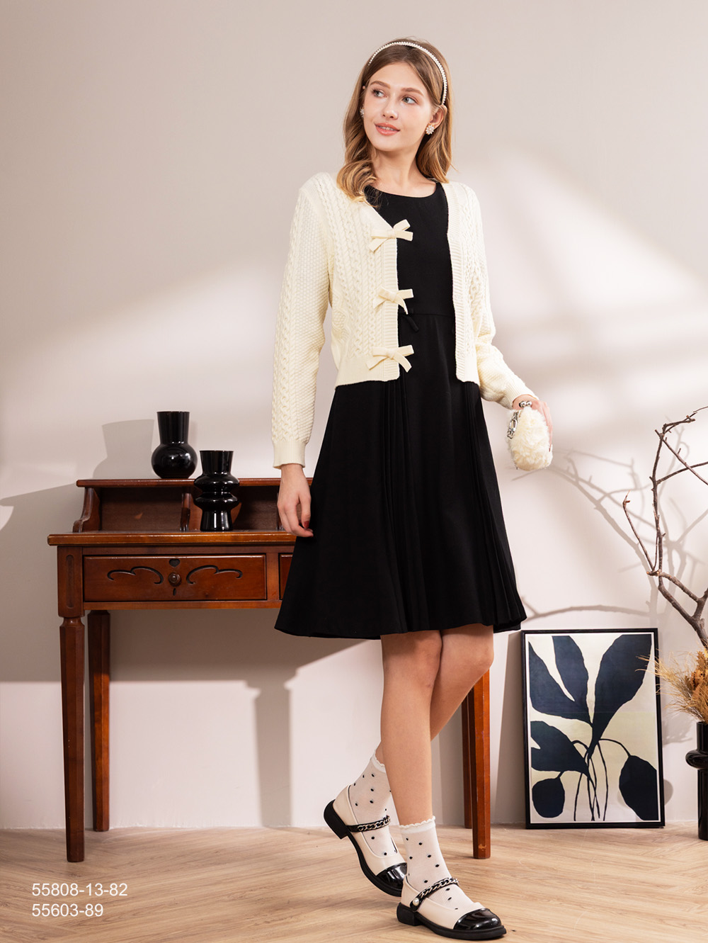 織紋粗呢面料 撞色織帶裝飾 裙擺百褶設計