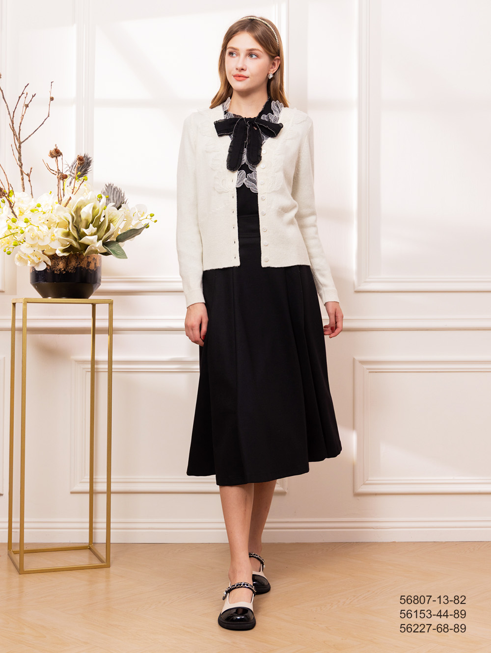 織紋粗呢面料 撞色織帶裝飾 裙擺百褶設計