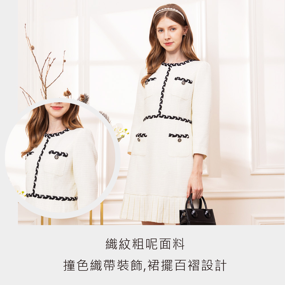 織紋粗呢面料 撞色織帶裝飾 裙擺百褶設計